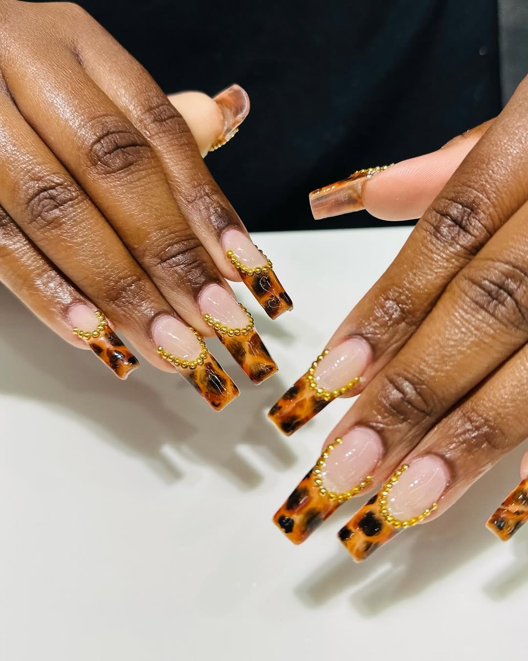 Now this is gold flair with attitude. Classic nude bases transition into tortoiseshell tips, outlined with tiny gold beads that trace the smile line like a chain.