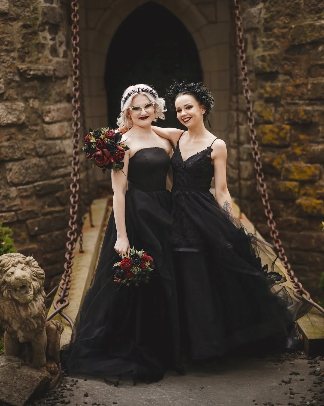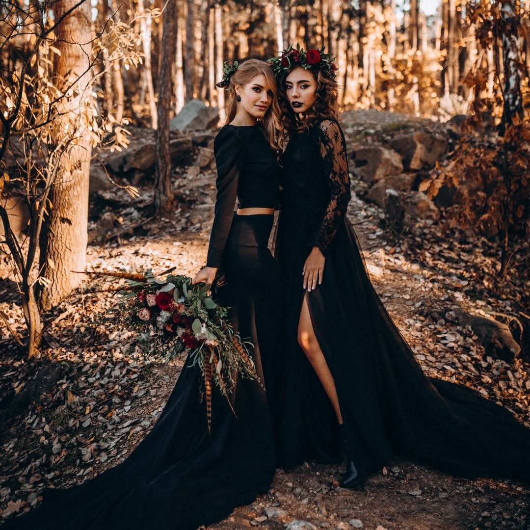 Two brides, two black gowns, and one breathtaking scene that could belong in a gothic novel. One wears a classic strapless cut, the other in delicate lace — together, they redefine bridal elegance with a touch of playful darkness.