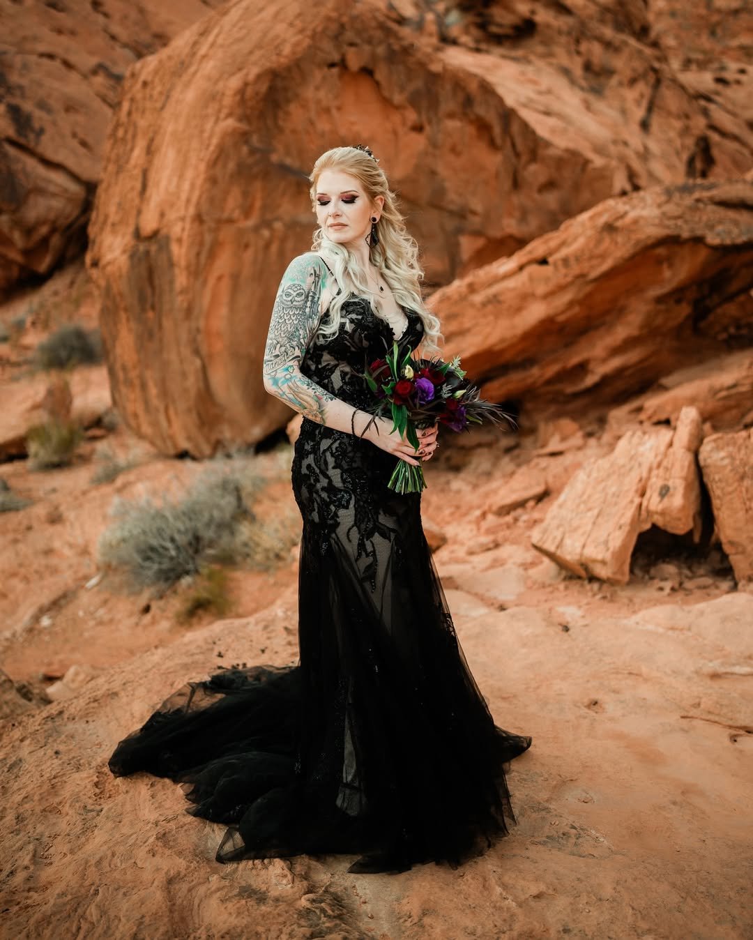 A black lace gown meets the red desert — and somehow, it just works. The contrast between her pale hair, the fiery rocks, and the inky dress creates a palette straight out of a gothic western fantasy.