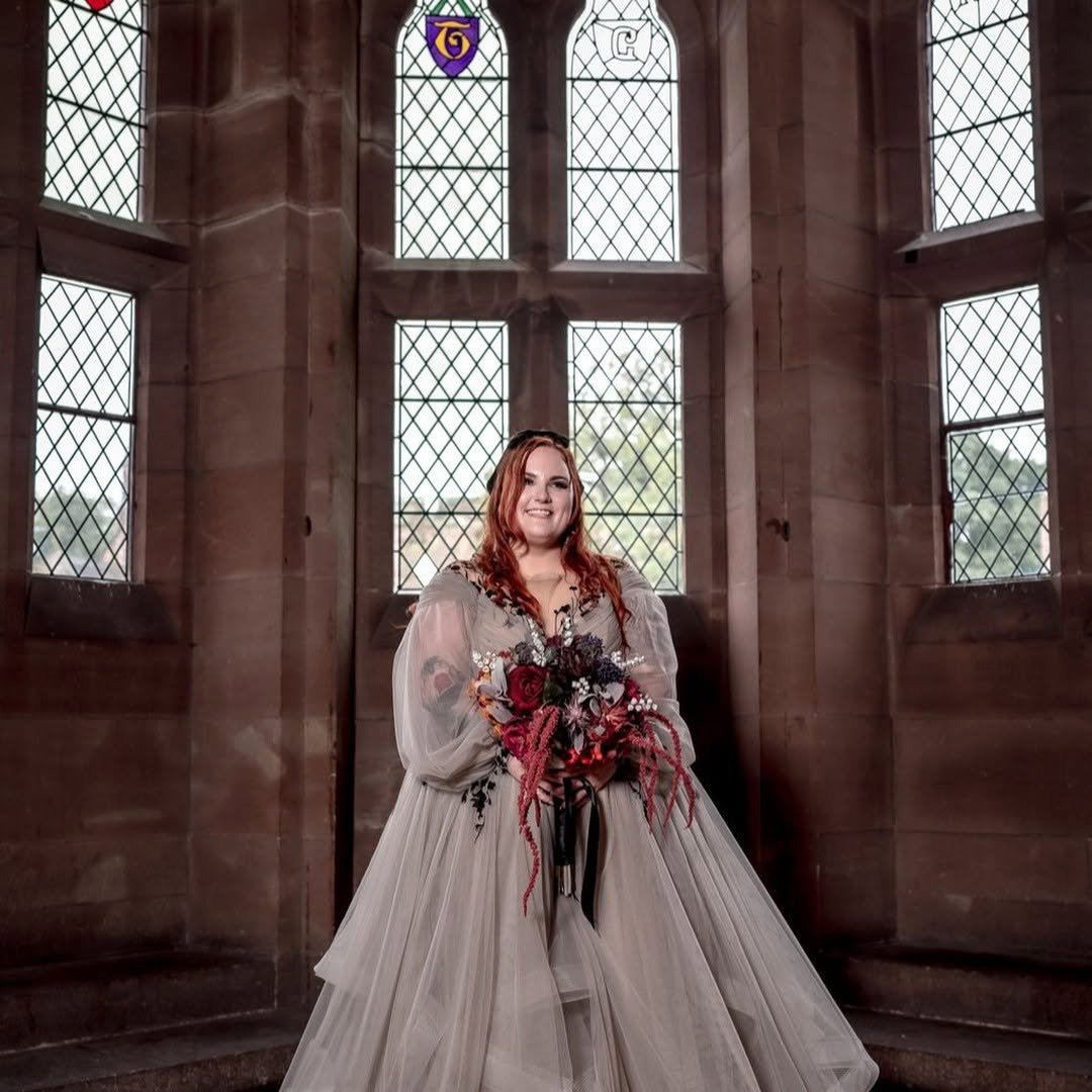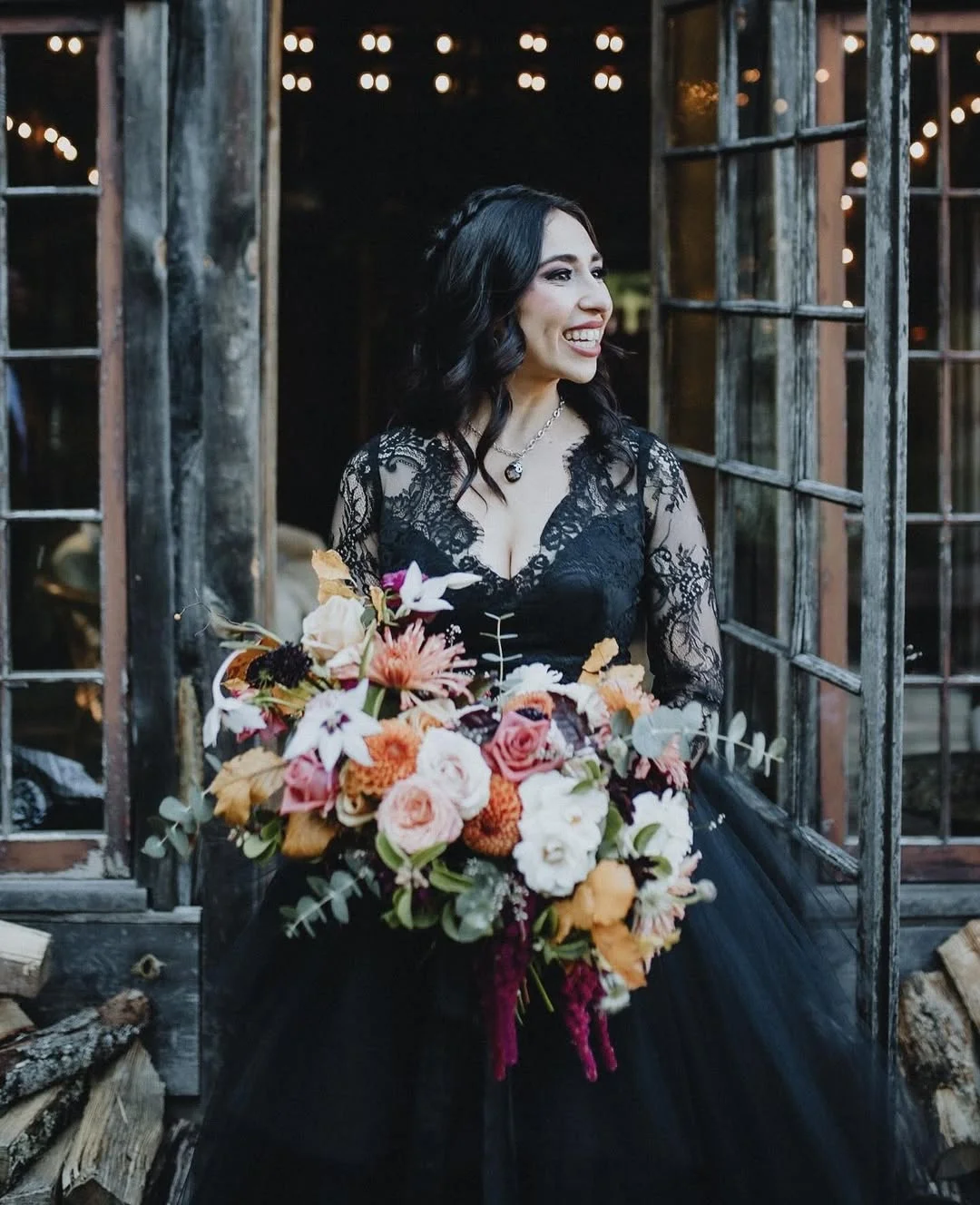 Lace, volume, and just the right amount of wild magic — this gown channels gothic femininity with warmth and light. The bouquet bursts in autumnal hues, adding a rich counterpoint to the deep black dress.