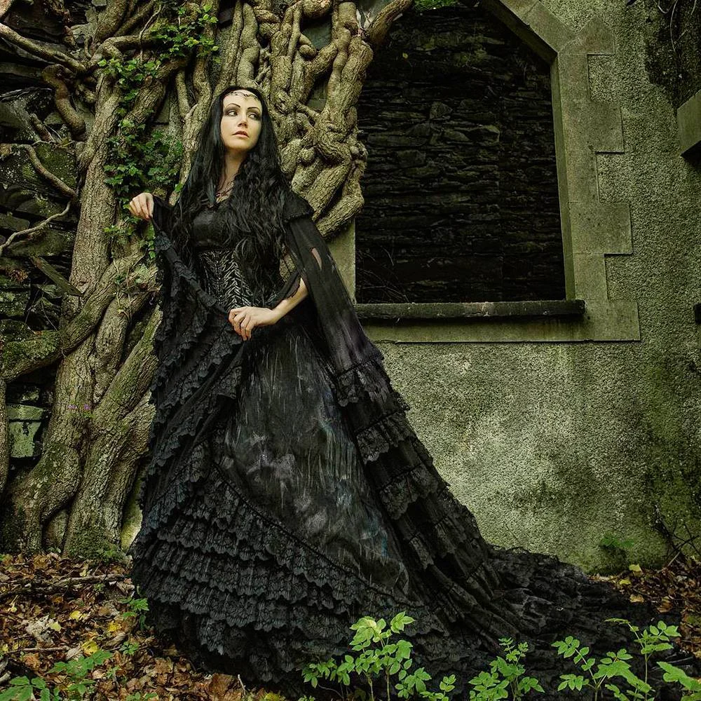 Here’s where gothic meets fierce femininity. The corset bodice, touched with hints of red embroidery, looks almost enchanted — like something out of a haunted fairytale. Against the stone staircase and twisted vines, the effect is pure drama.