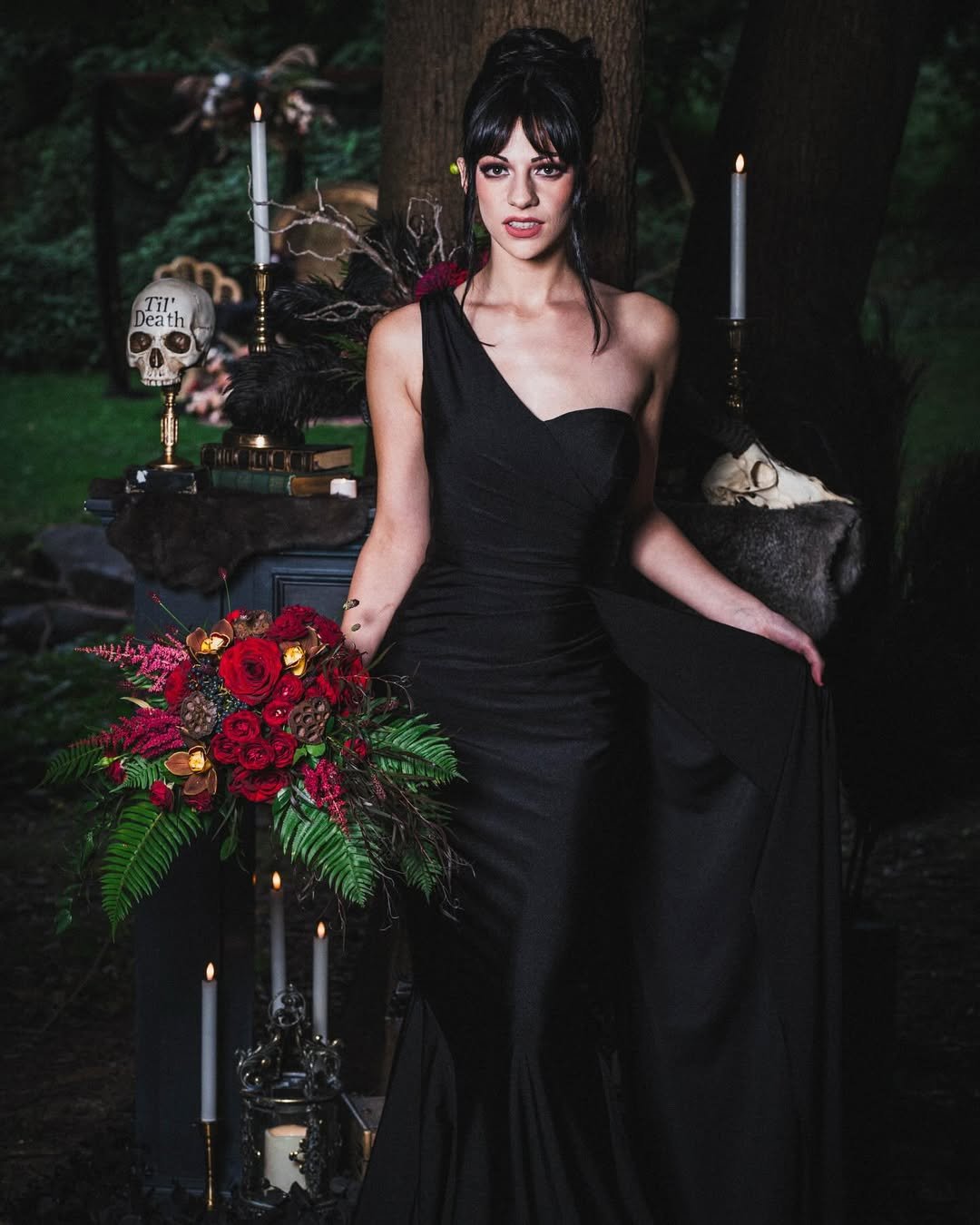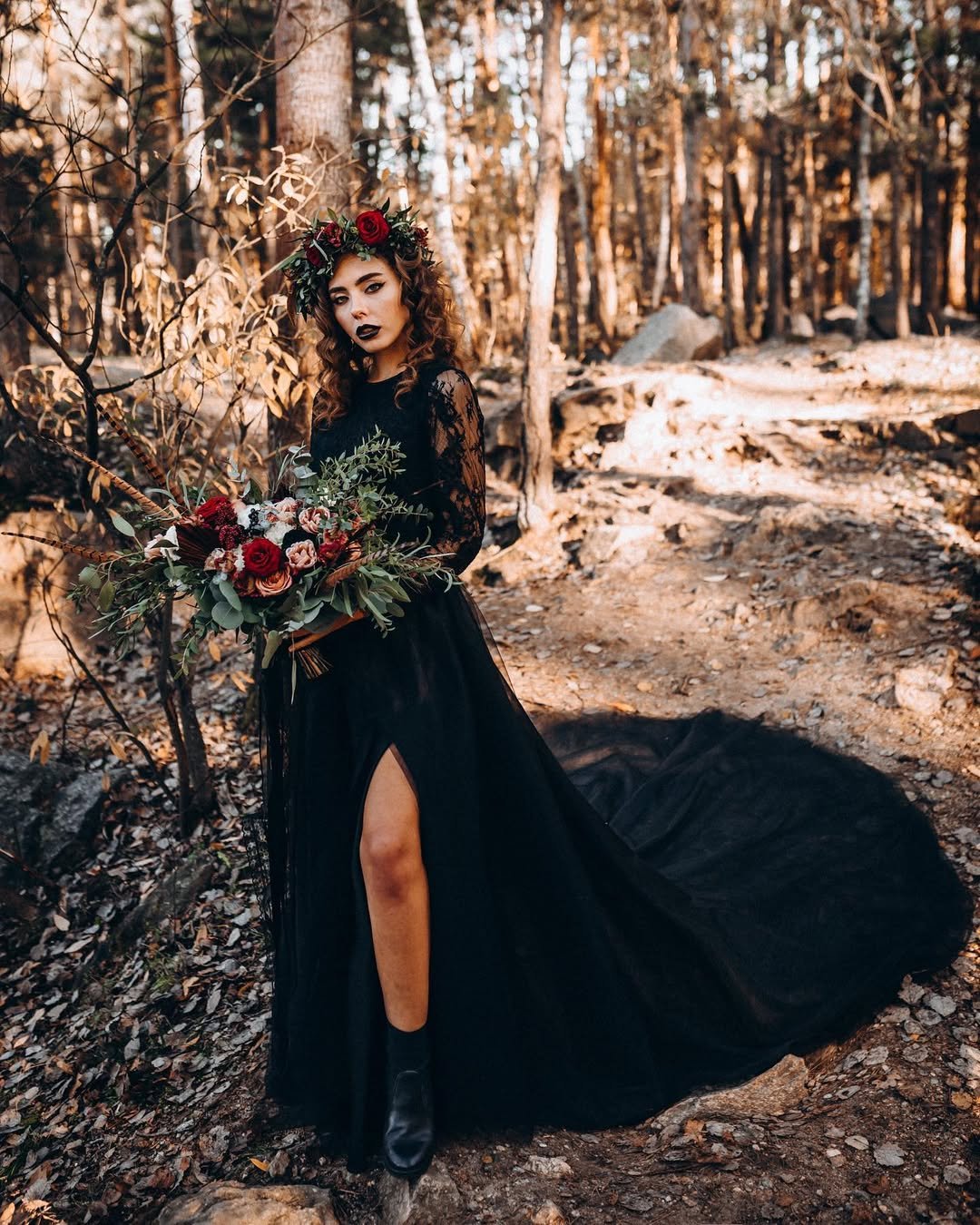 It’s gothic, but wild — grounded in nature, yet dripping in fantasy. The bouquet of roses and feathers adds that perfect rustic darkness.