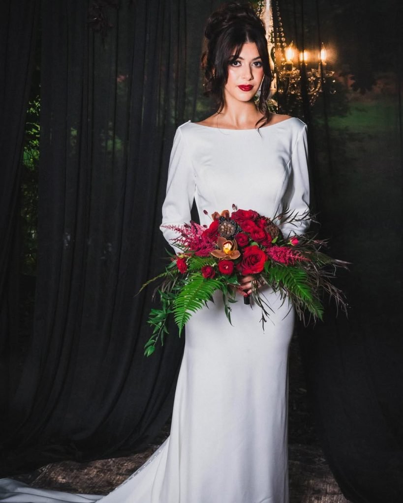 Here, the mood shifts from deep shadow to ghostly light — the same gothic heart, but told in ivory and black contrast. The long-sleeve silhouette, paired with the moody bouquet, captures a story of duality — purity and power intertwined.