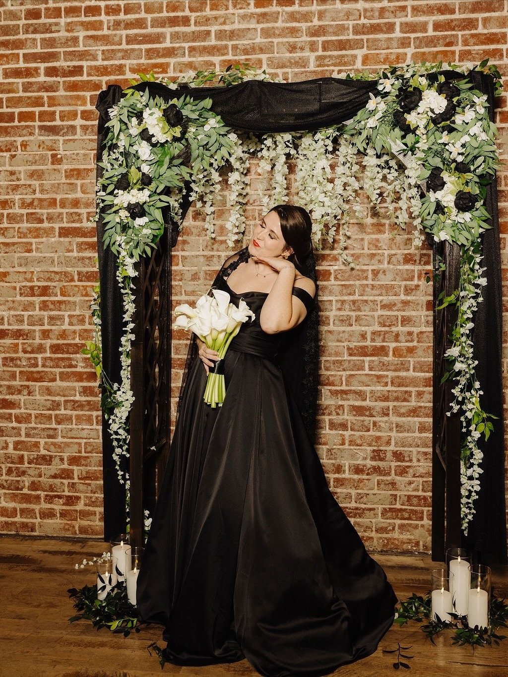 A soft gothic fantasy framed against brick and cascading florals. The deep black satin gown shines under warm light, its structured bodice and flowing skirt giving it a cinematic sense of movement.