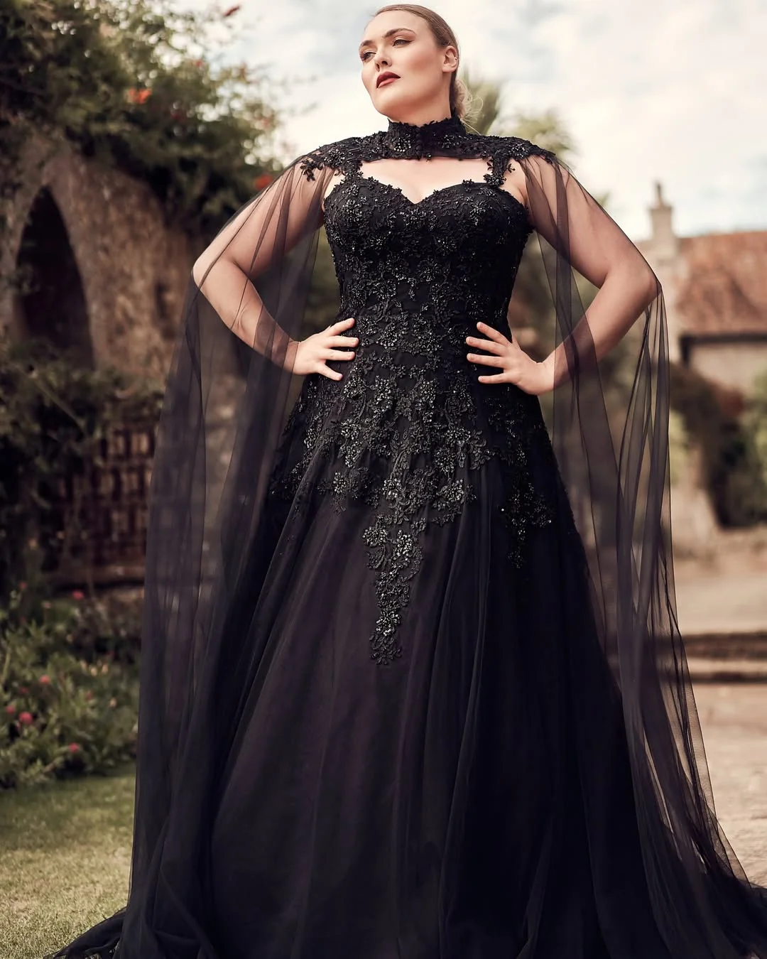 Here’s gothic romance dialed to divine — layers of embroidered lace and sheer cape sleeves that float like smoke. The neckline traces her shoulders in delicate detail, turning a traditional ballgown into something almost celestial.