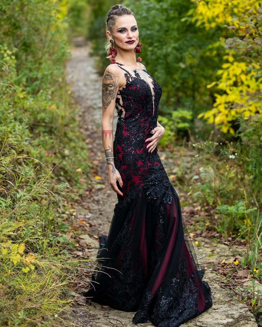 This is gothic allure with an edge. The combination of black lace and deep red undertones feels like passion woven into fabric. Every tattoo, every bold earring adds another layer of character — it’s personal, fierce, and unforgettable.