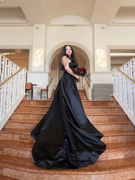 She’s not trying to fit in with bridal standards — she’s rewriting them with every shimmer of black.