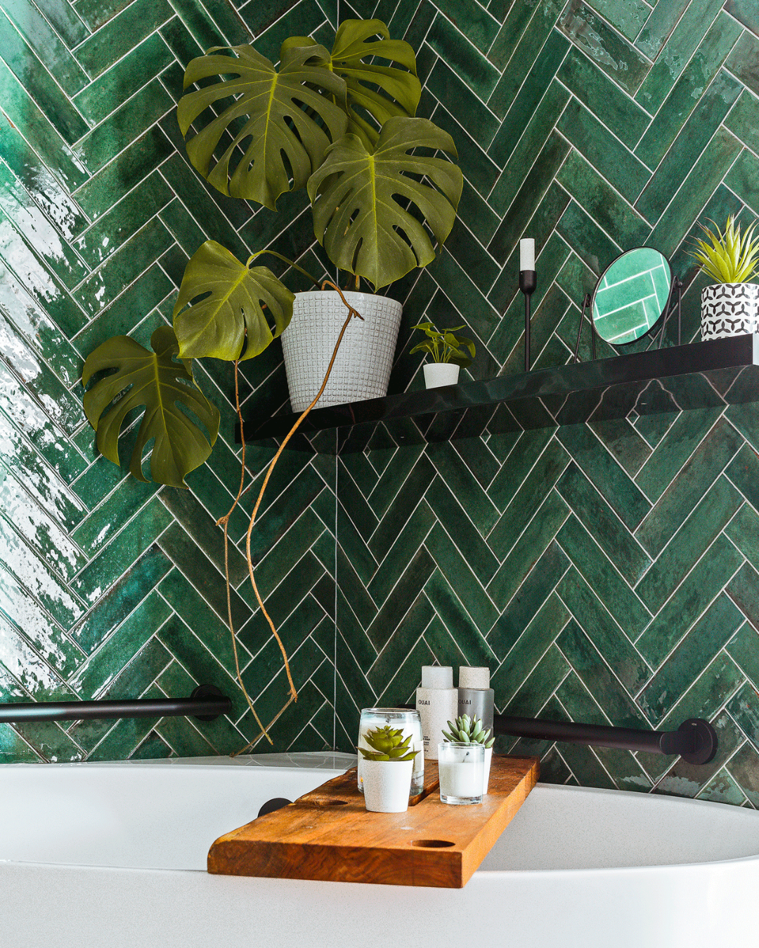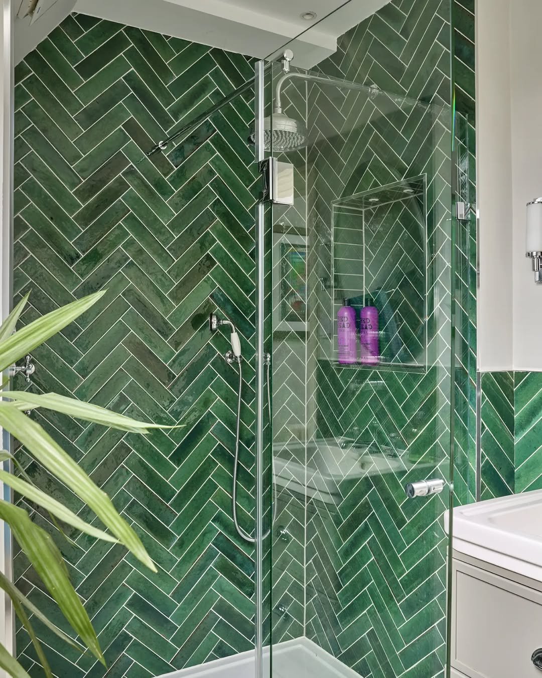 This is where green goes bold. That glossy herringbone tile wraps the shower in texture and movement, catching the light in all the right ways. It’s rich, slightly moody, but still super polished.