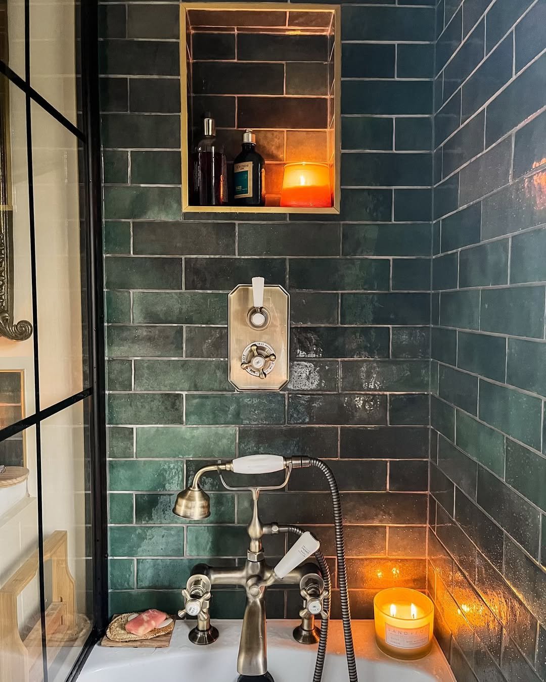 This one is all about mood. The deep green tiles paired with that warm candle glow create such an intimate, cozy vibe.