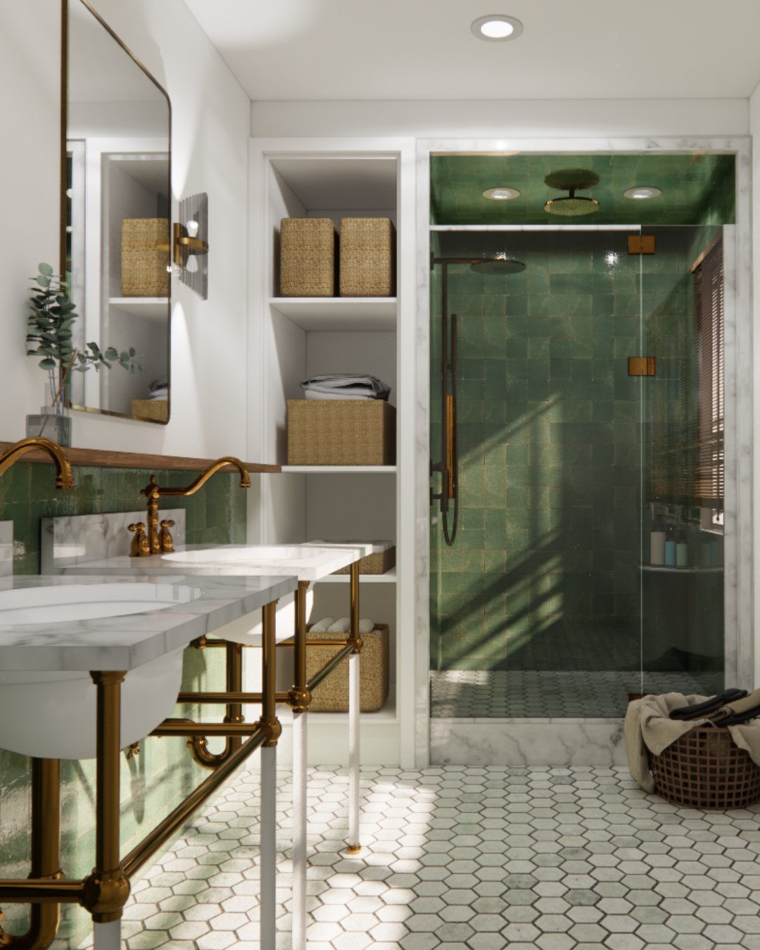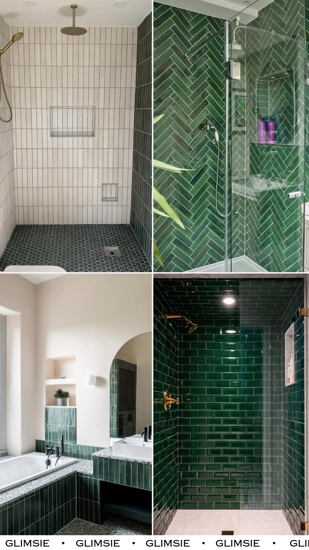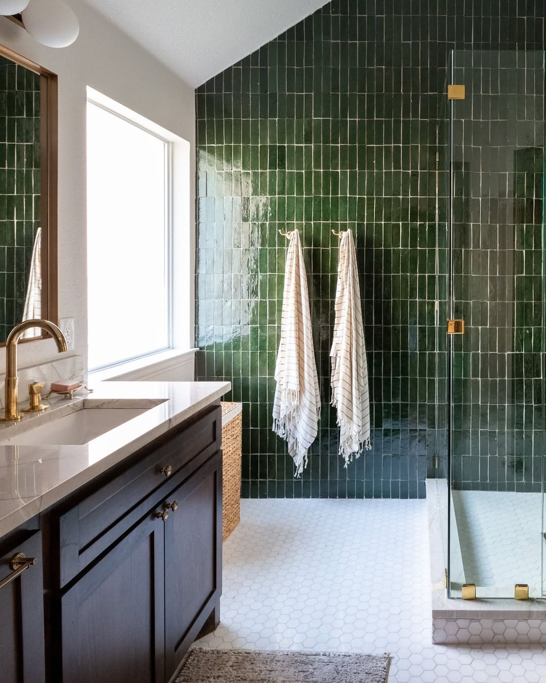 This one just hits that sweet spot between bold and balanced. The glossy deep green tiles feel rich and layered, but the white hex floor keeps everything light and breathable.