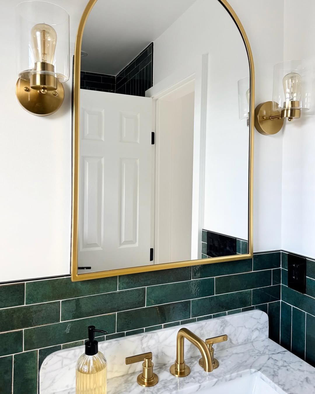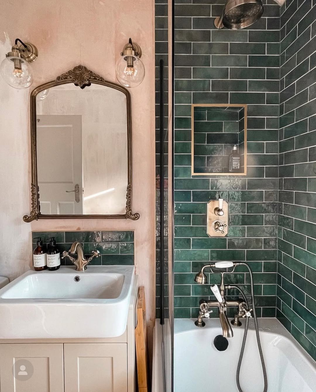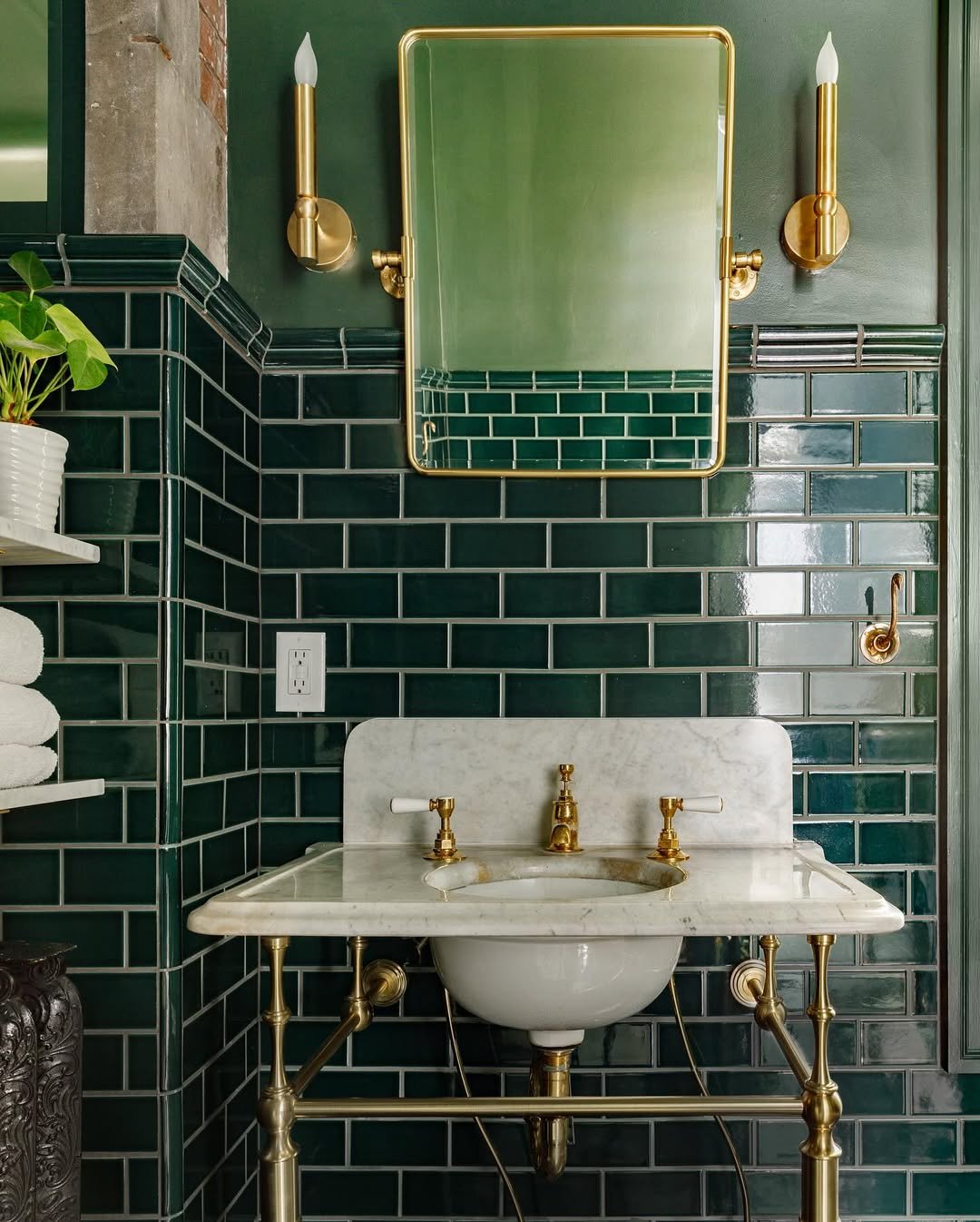 This one leans classic in the best way. The rich green subway tiles, marble sink, and warm brass details bring that timeless, almost heritage feel.