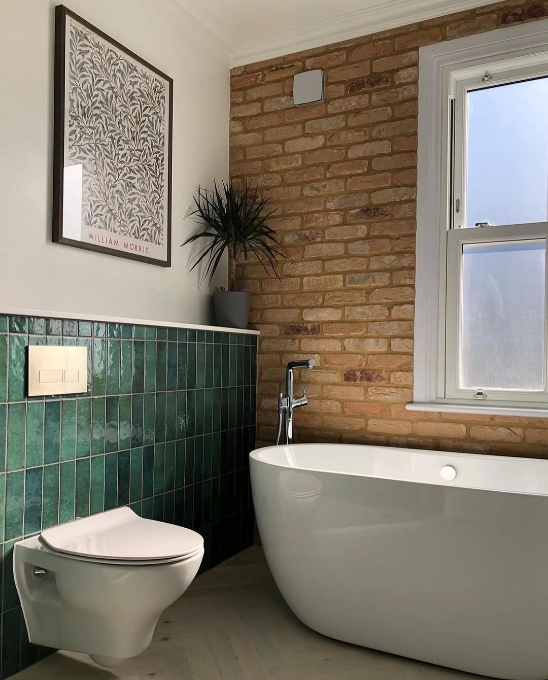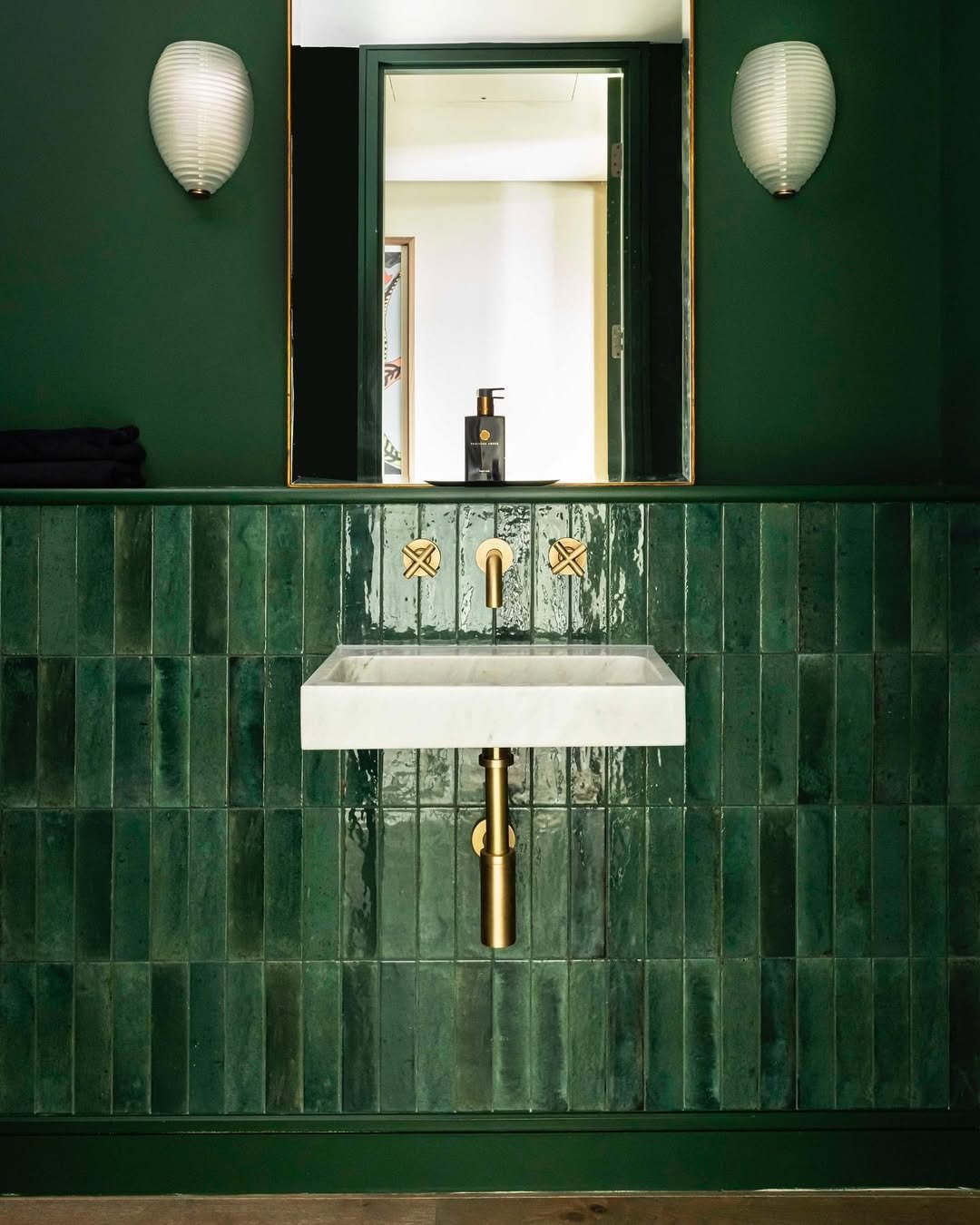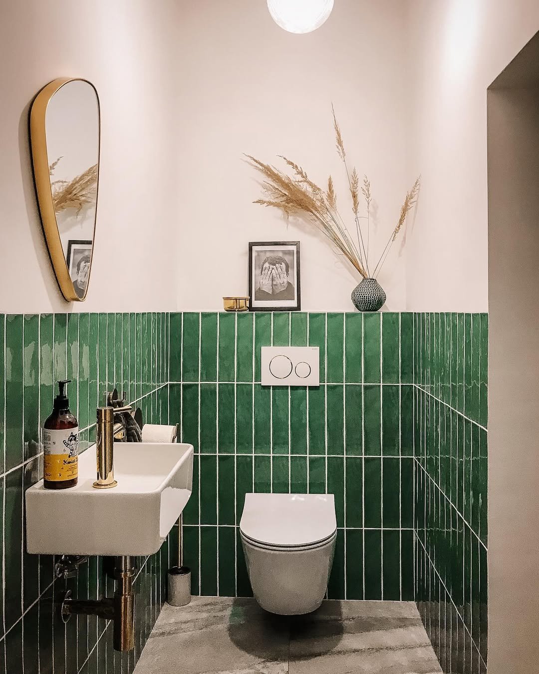 Half-height green tiles? Always a good idea. They add character without overwhelming the space, especially paired with soft wall tones and vintage-inspired decor.