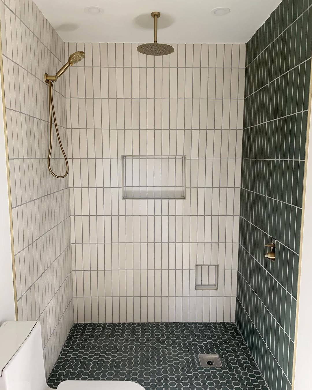 This one is all about balance done right. Crisp white vertical tiles keep things feeling fresh and open, while that deep green side wall adds just enough contrast to ground the space. And those penny tiles on the floor? Subtle, but they tie everything together beautifully.