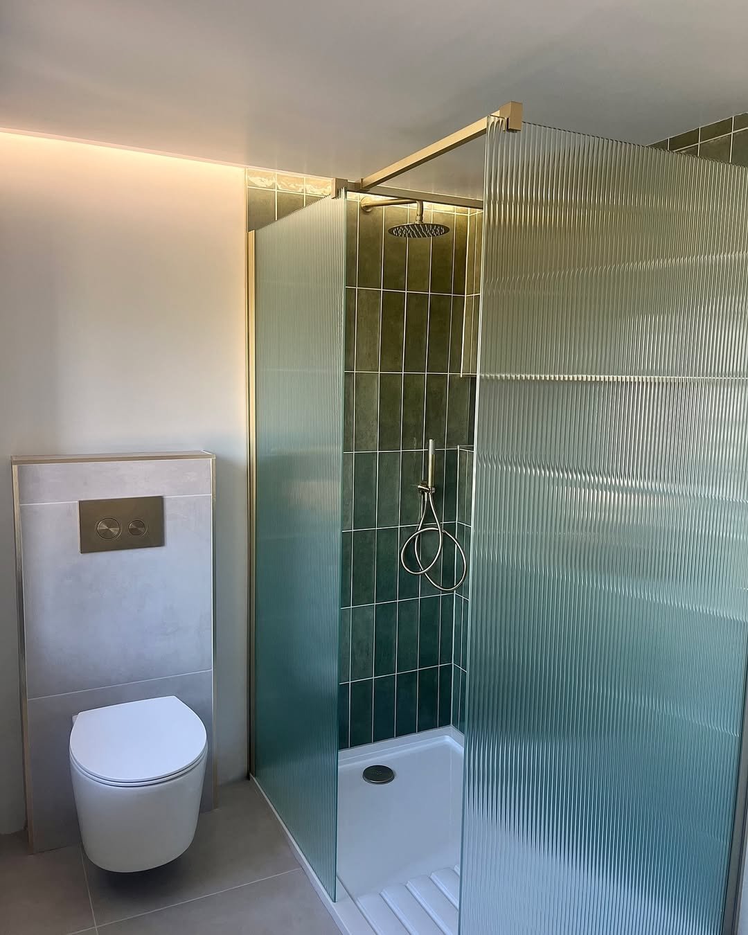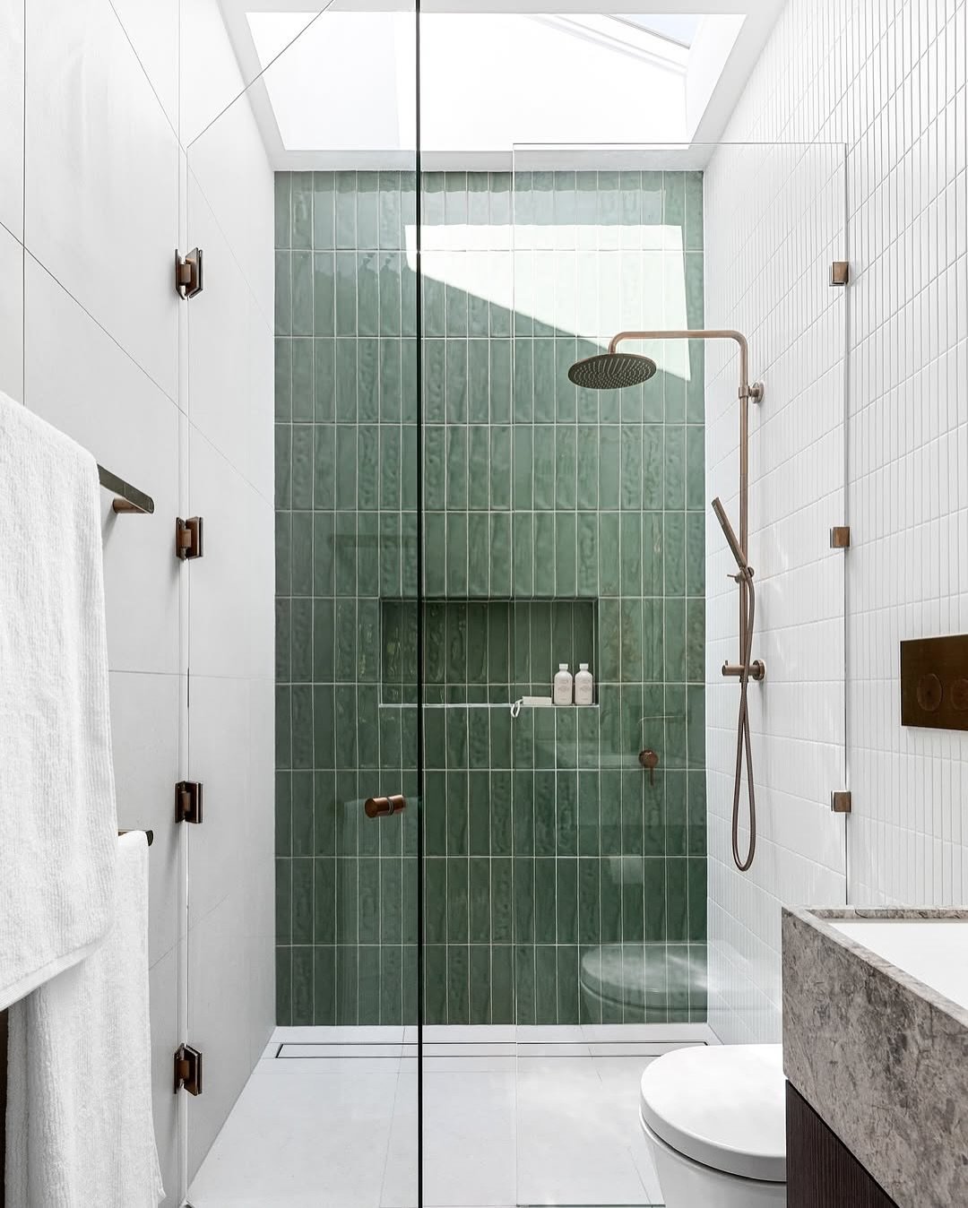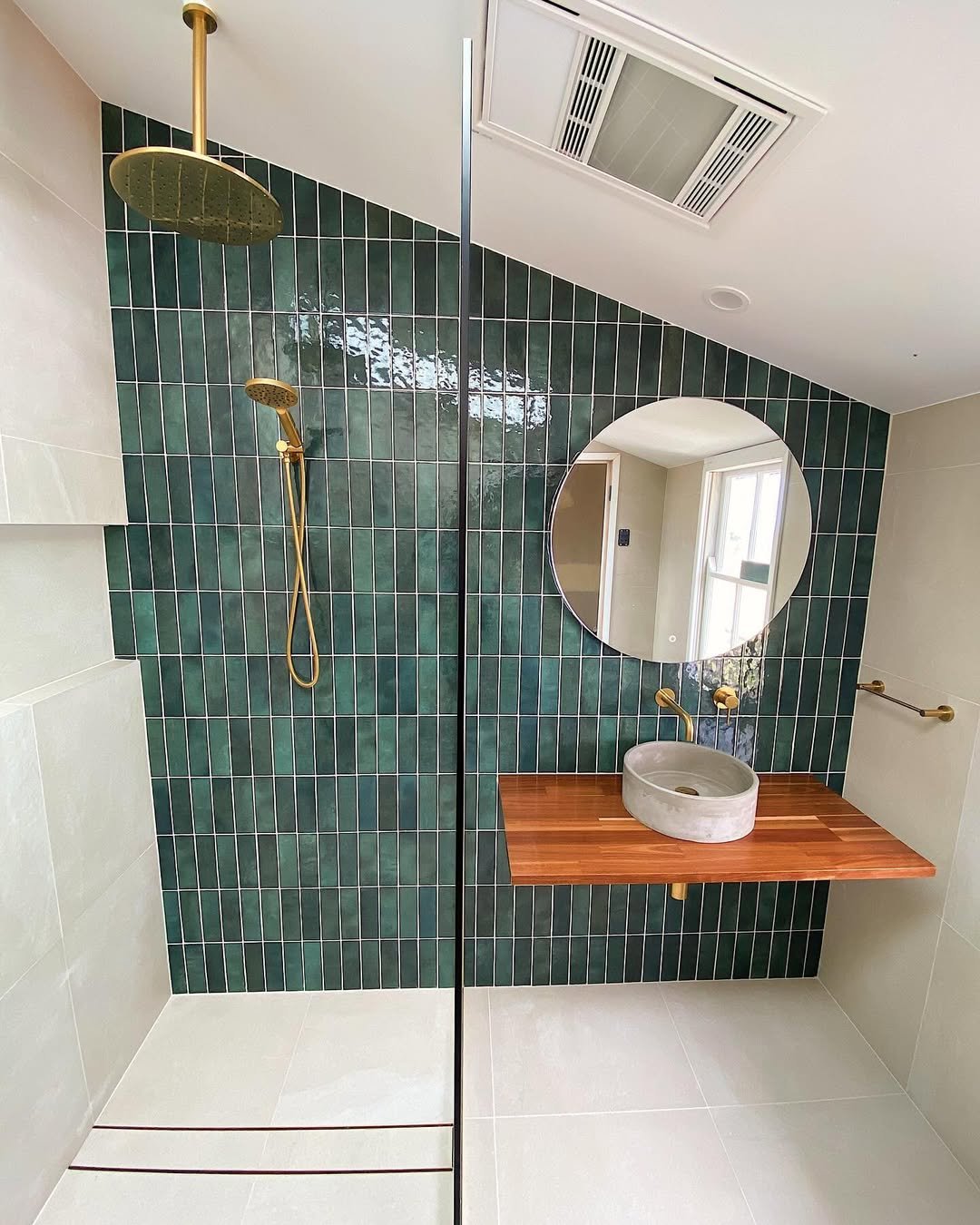 Now this is sleek. The green tile is subtle here, letting that ribbed glass shower screen steal a bit of the spotlight. It’s minimal, but with a twist.
