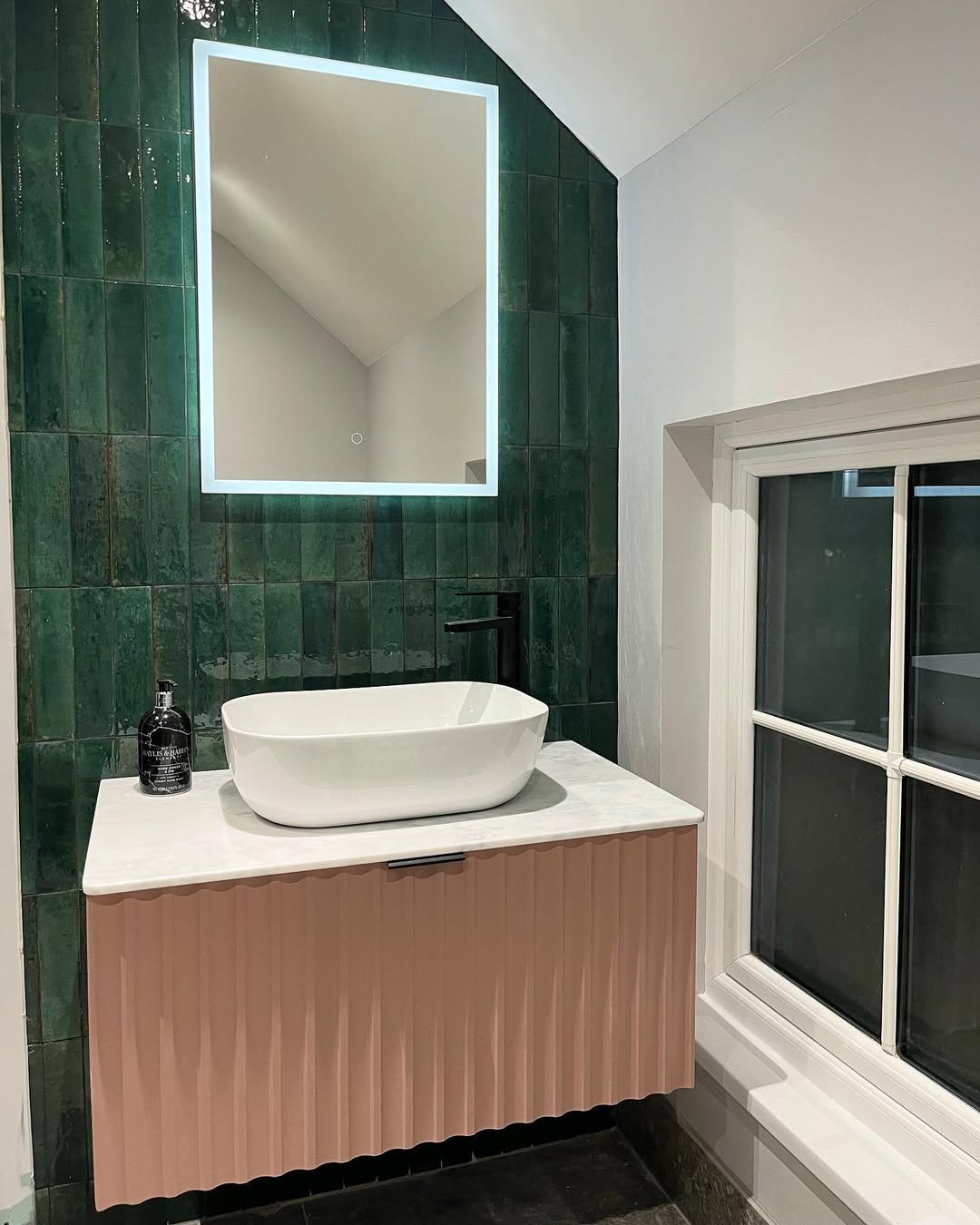 This space plays with light in such a cool way. The darker green tiles absorb just enough to feel moody, while the mirror lighting adds that soft glow.