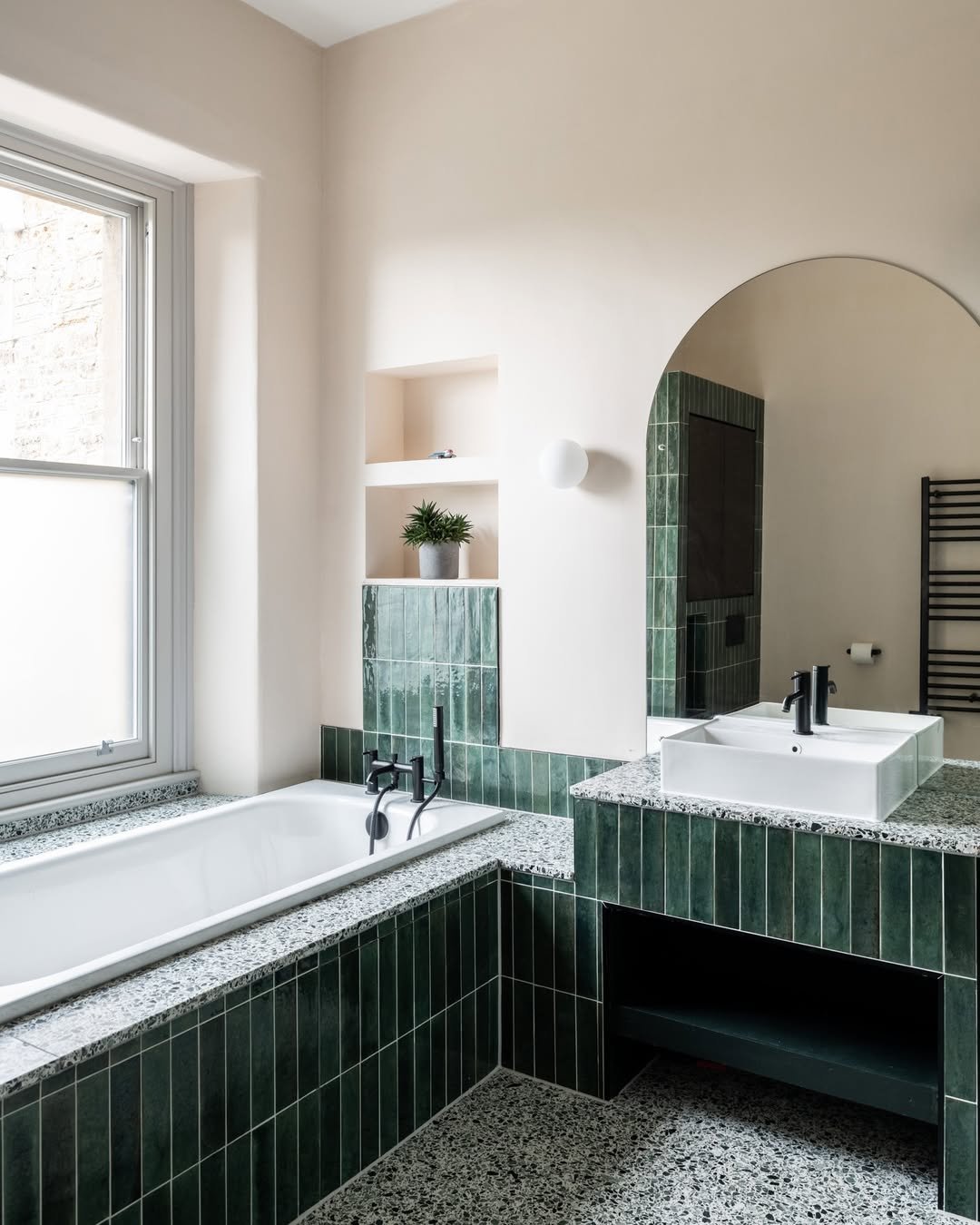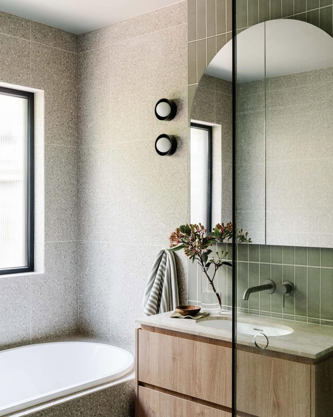 Muted green tiles paired with terrazzo? That’s a quiet power move. The palette feels calm, almost spa-like, with just enough texture to keep things interesting.