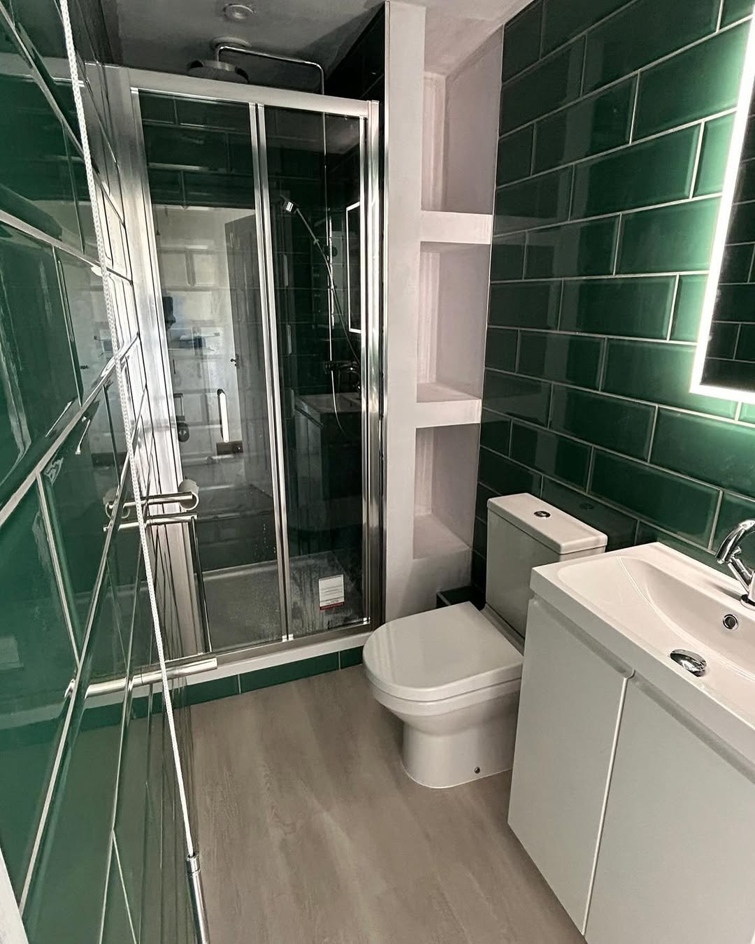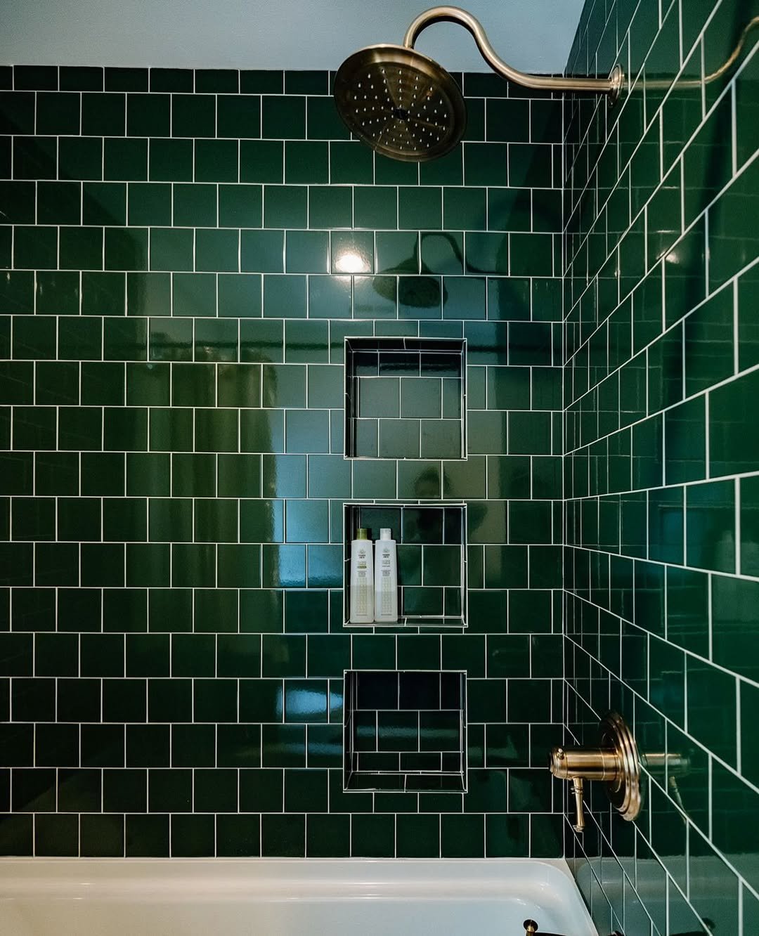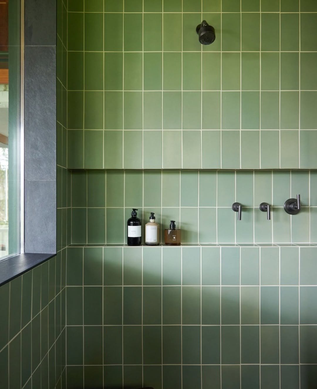 This one feels like a nod to tradition, but with a fresh lens. The rich green tiles, paired with clean lines and simple niches, give it that timeless bathroom energy.