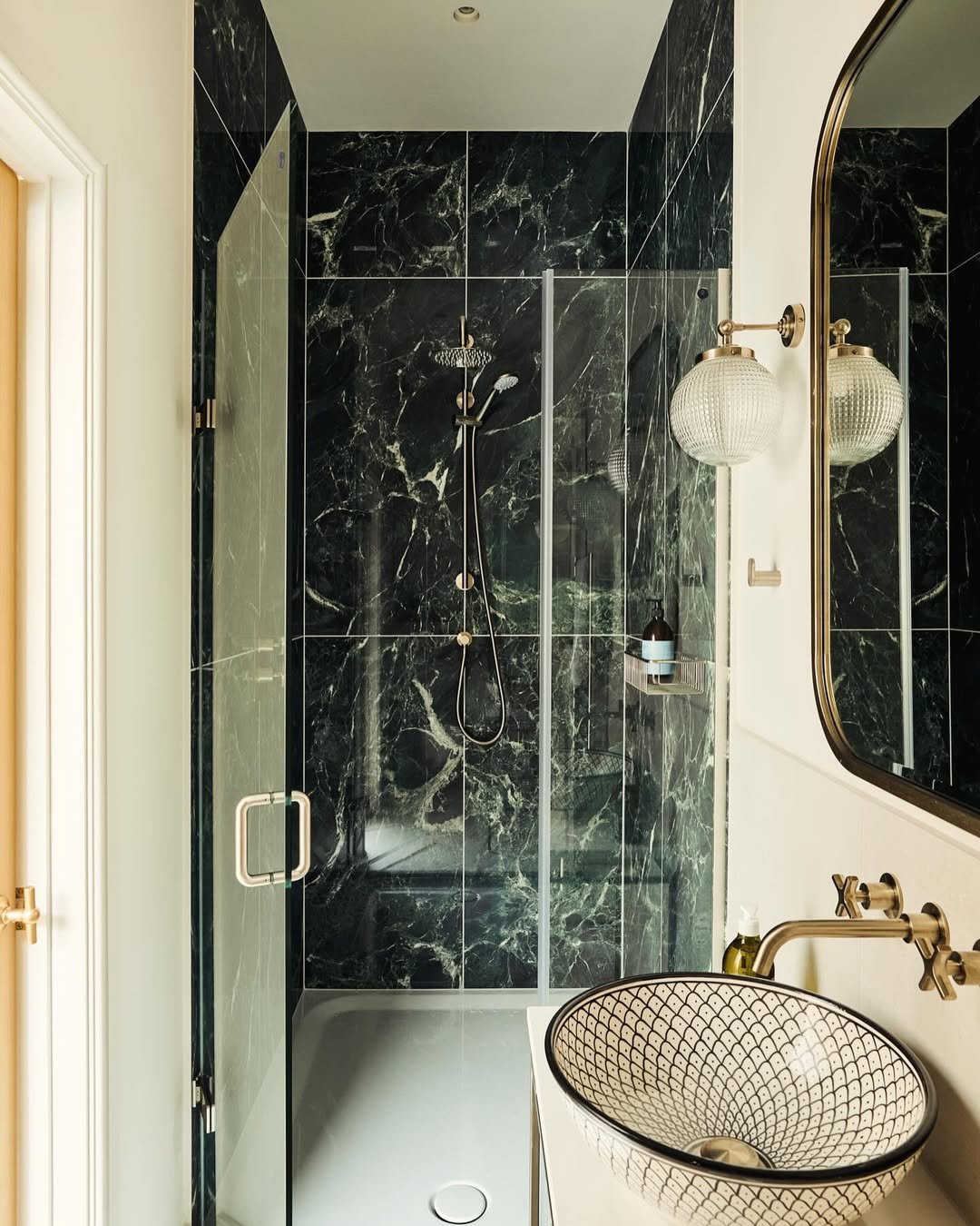 This one leans straight into drama—and it works. Those deep green marble-effect tiles bring a rich, almost cinematic vibe, especially paired with warm brass and soft lighting. It feels luxe, but not overdone.