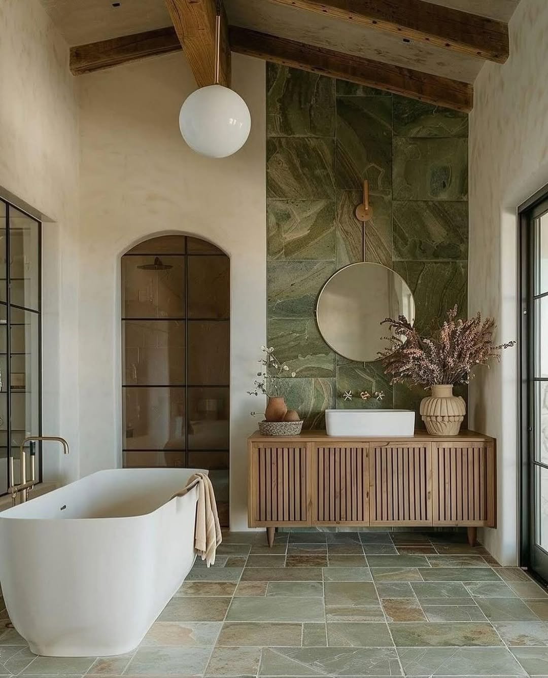 There’s something really grounding about this space. The natural stone-look green tiles, wooden beams, and soft neutral walls all come together in that effortless, earthy way.