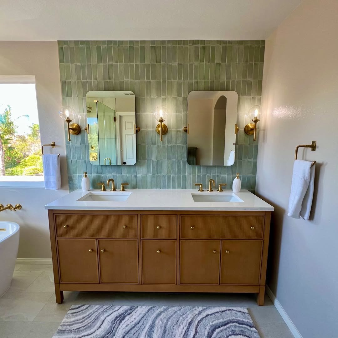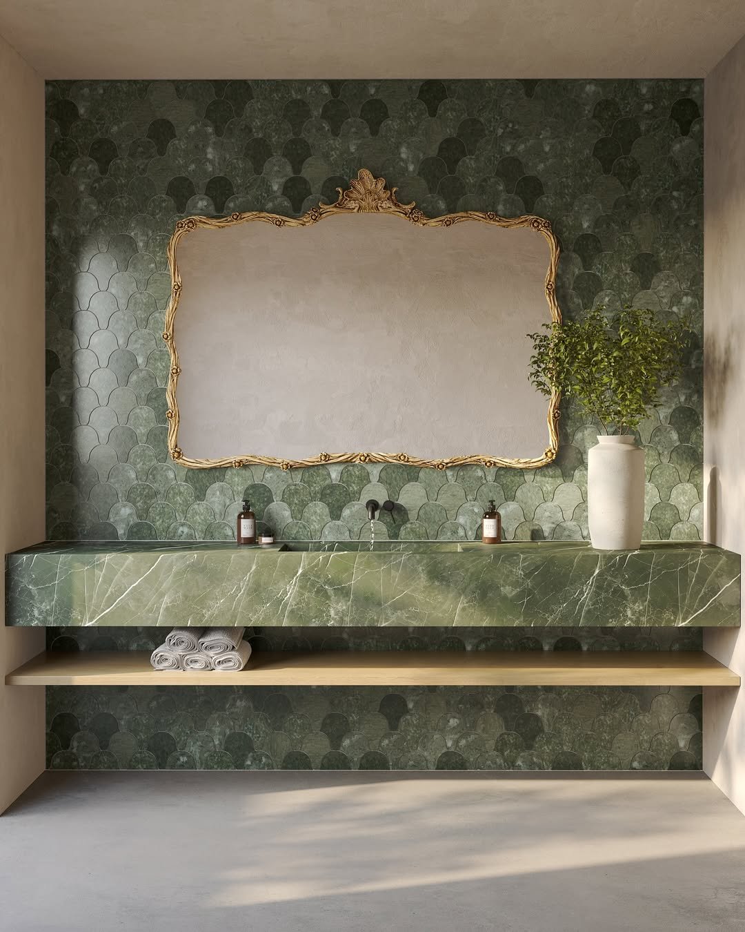 Okay, this is where things get a little dramatic—in a good way. The scalloped green tiles and that statement vanity bring texture and depth that feels almost architectural.