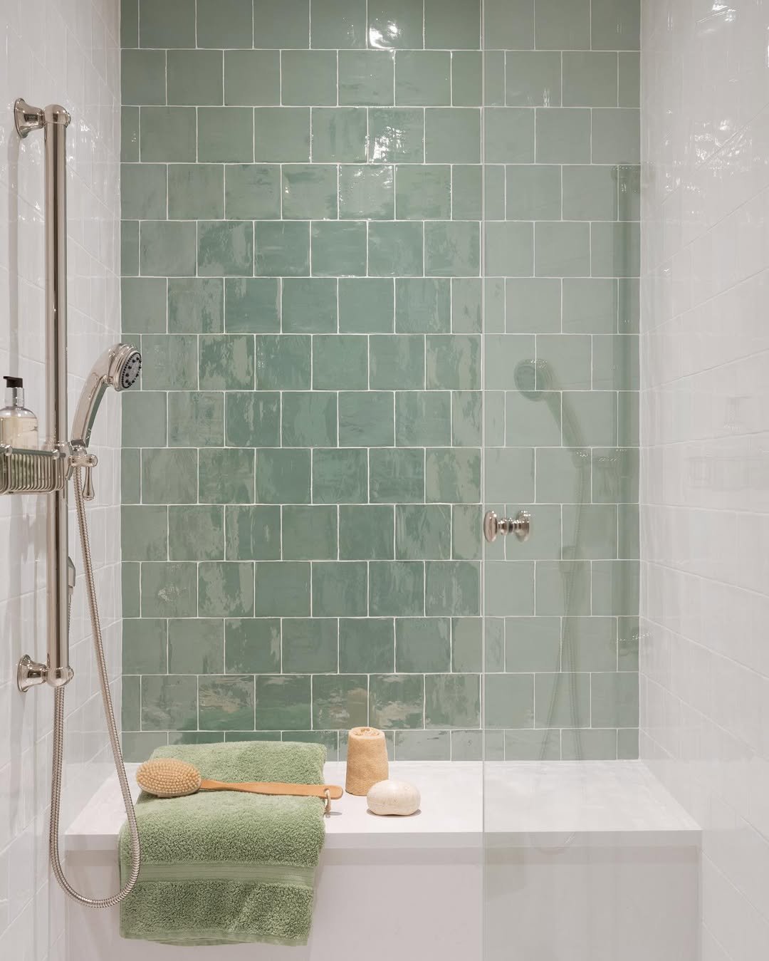 You’ve got that traditional green tile look, but styled in a more modern way. The clean fixtures and layout keep it from feeling dated.