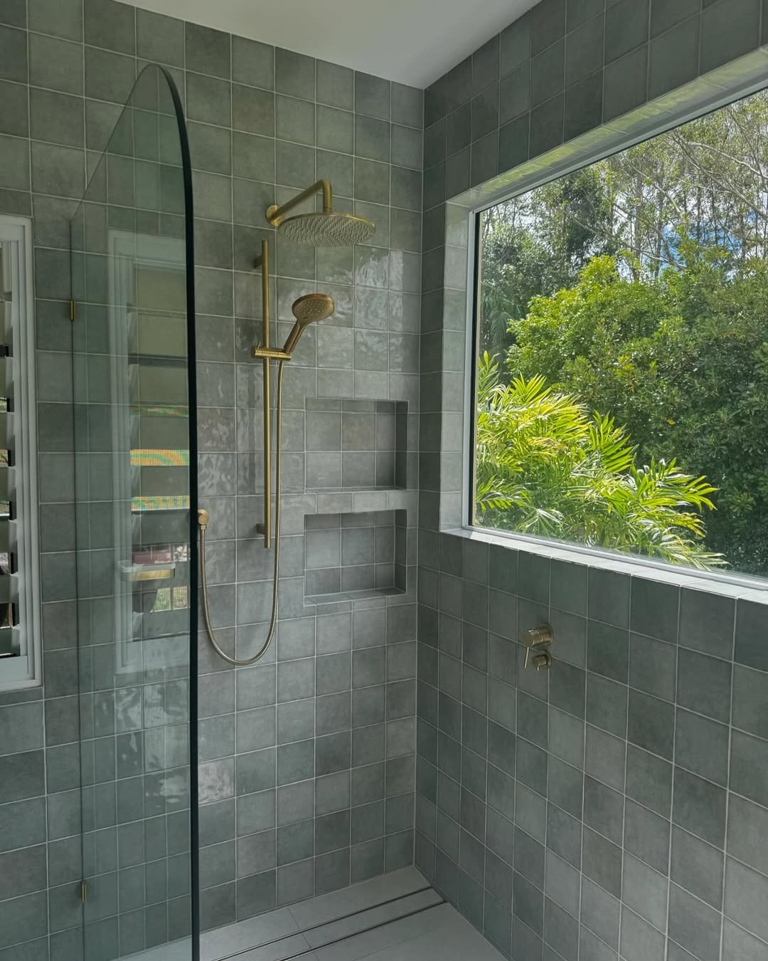 Natural light + soft green tiles = instant serenity. The big window turns this shower into a full-on spa moment, especially with those subtle tile tones.