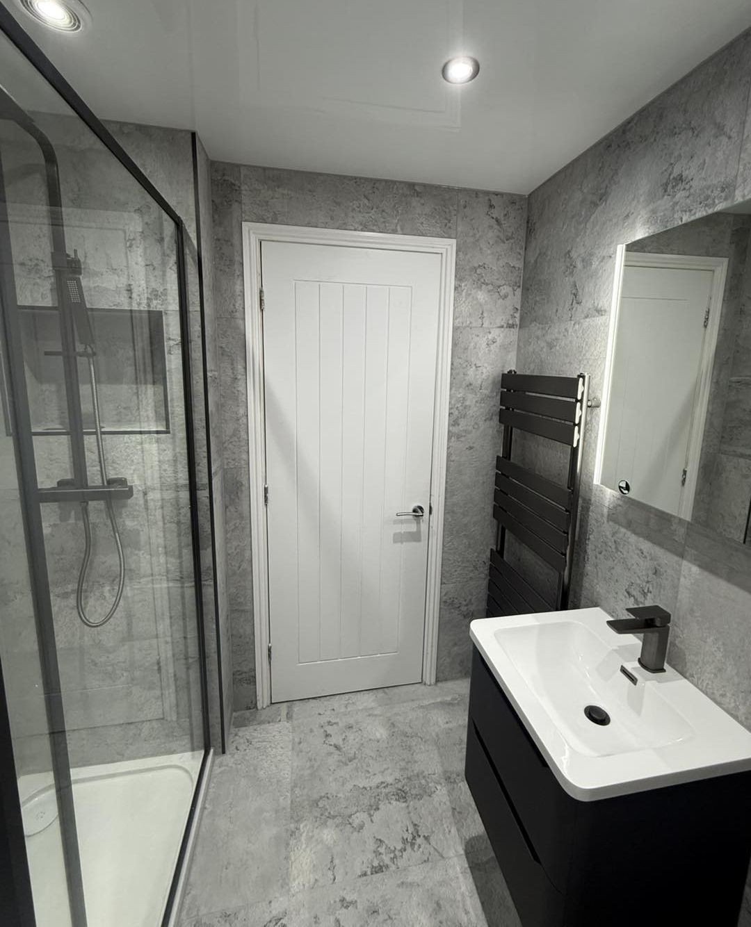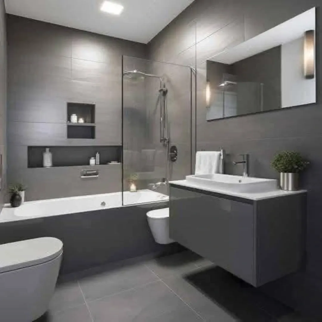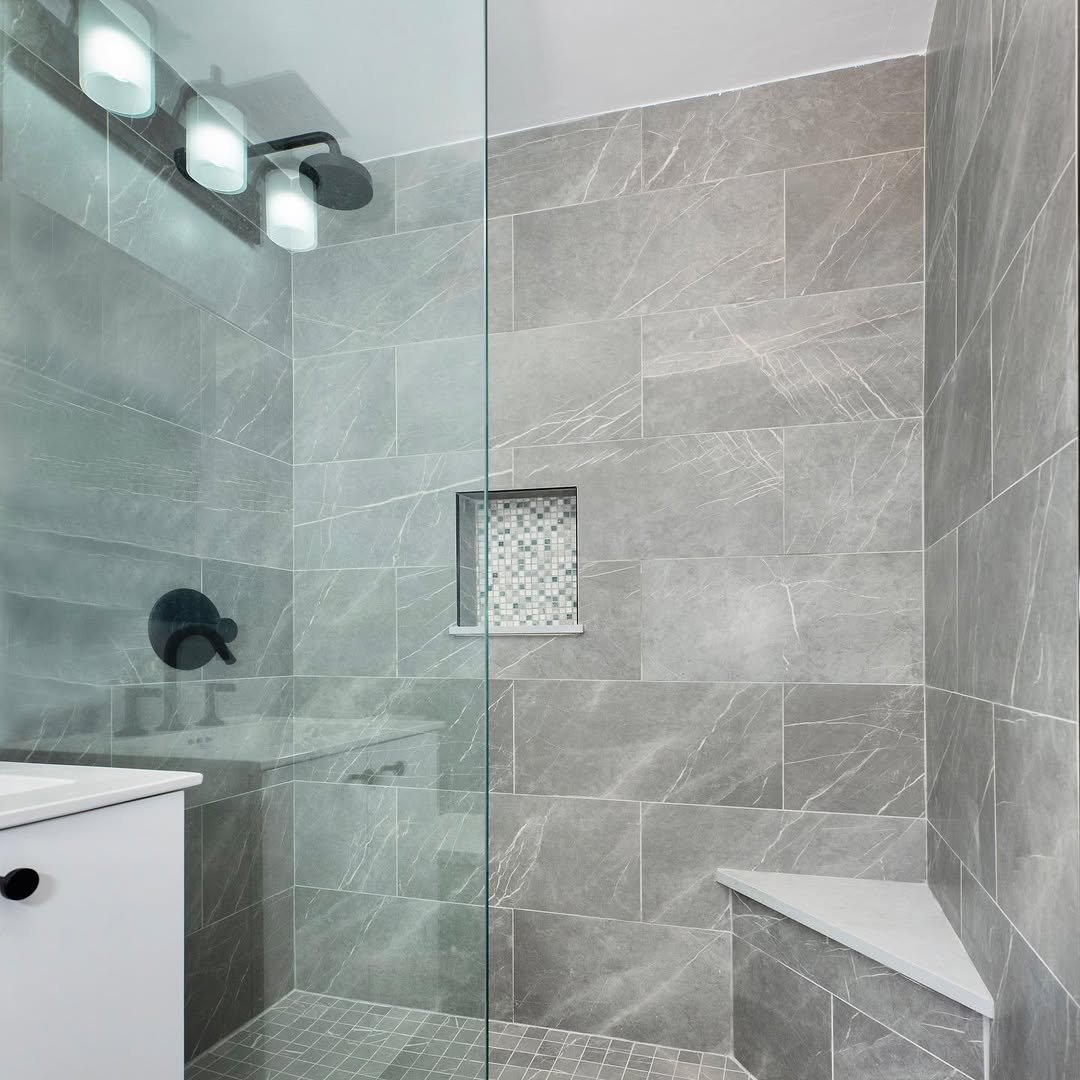 Grey doesn’t have to be flat—and this proves it. The variation in tile tones and subtle patterns adds depth without overwhelming the space.