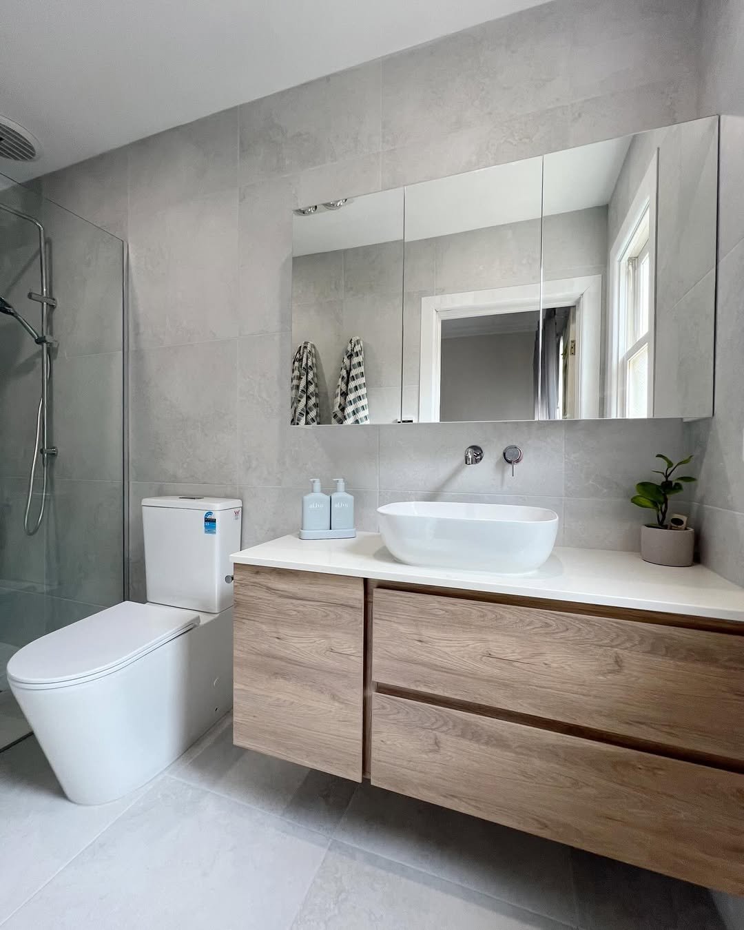 This is the kind of bathroom that makes you want to declutter your entire life. Sleek grey tiles, a floating vanity, and that oversized mirror working overtime to bounce light around.