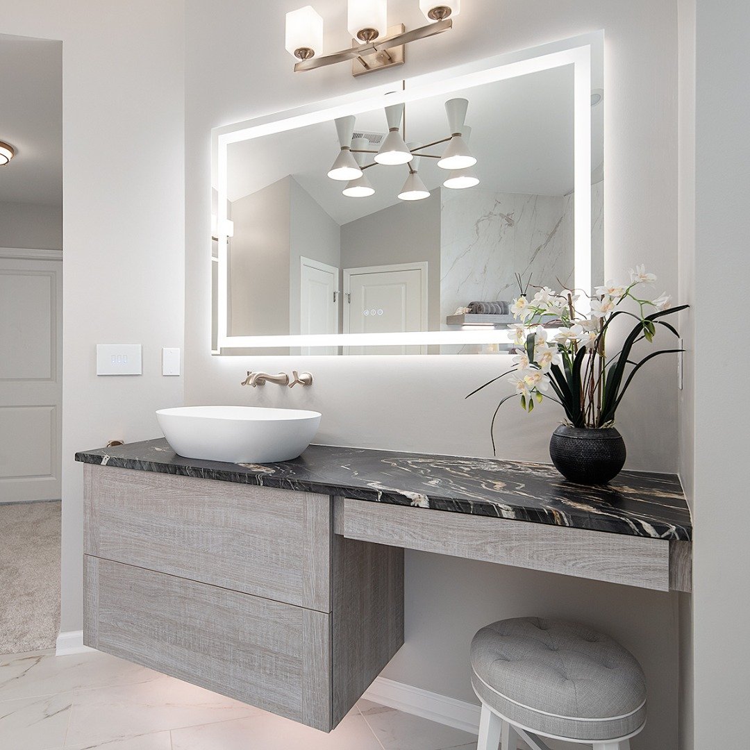 This setup is all about that vanity. The floating design, statement mirror, and layered lighting make it feel modern without losing warmth.