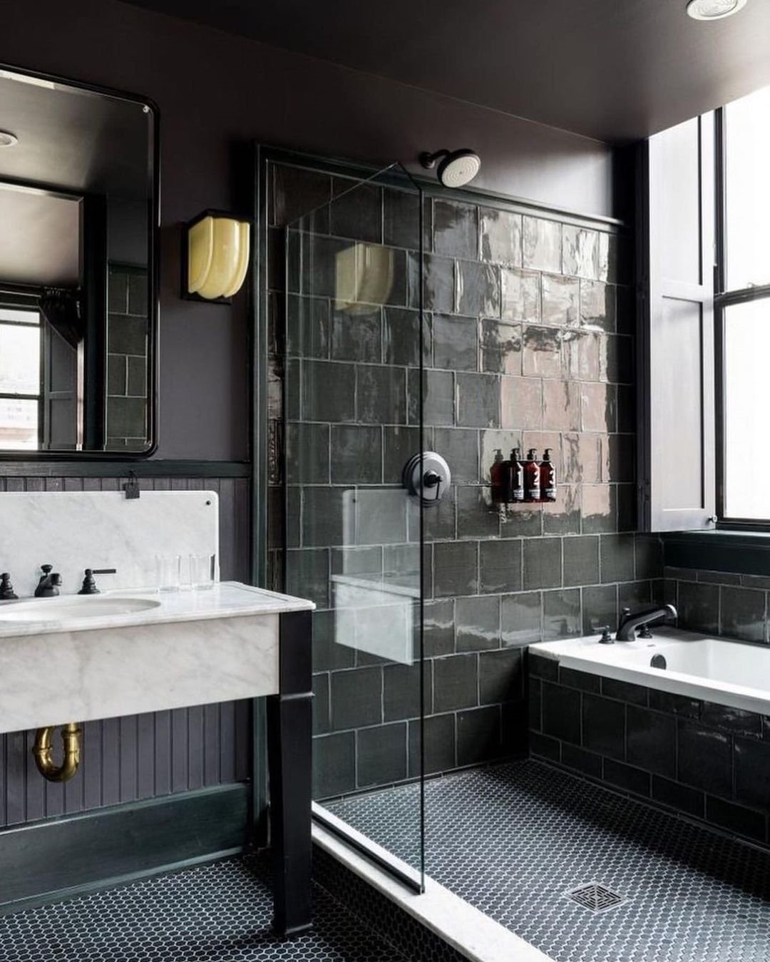 This one leans all the way into mood. Deep grey tiles with that glossy finish reflect just enough light to keep things interesting without losing the drama.