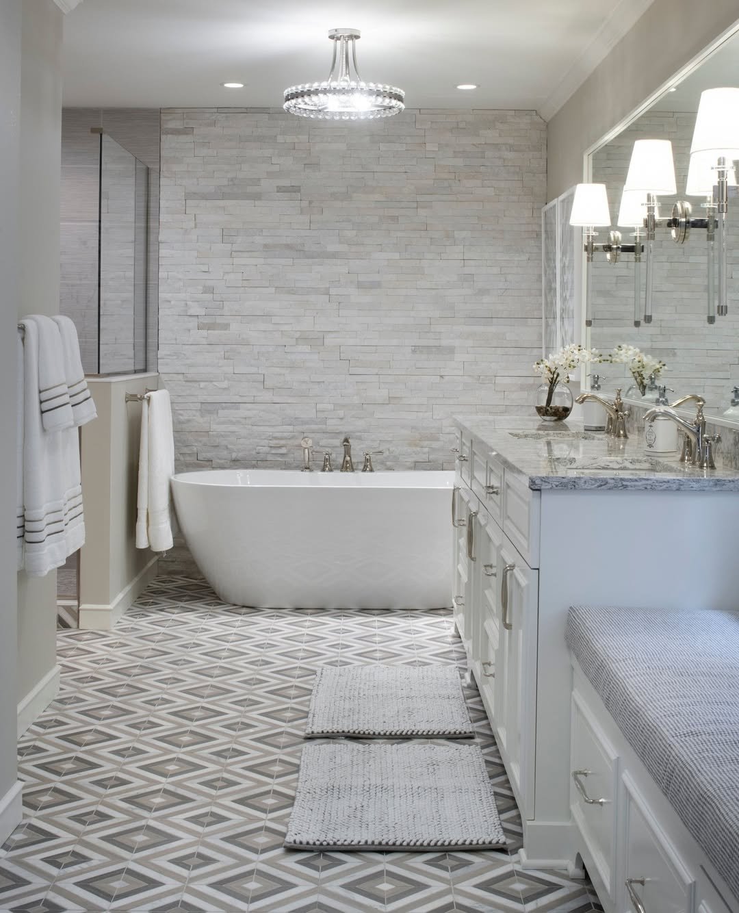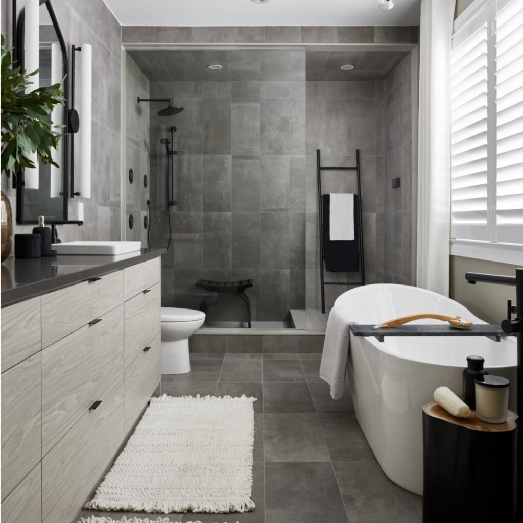 This one leans into relaxation hard—and honestly, we’re here for it. The freestanding tub, warm wood vanity, and layered greys create that spa-like calm without feeling staged.