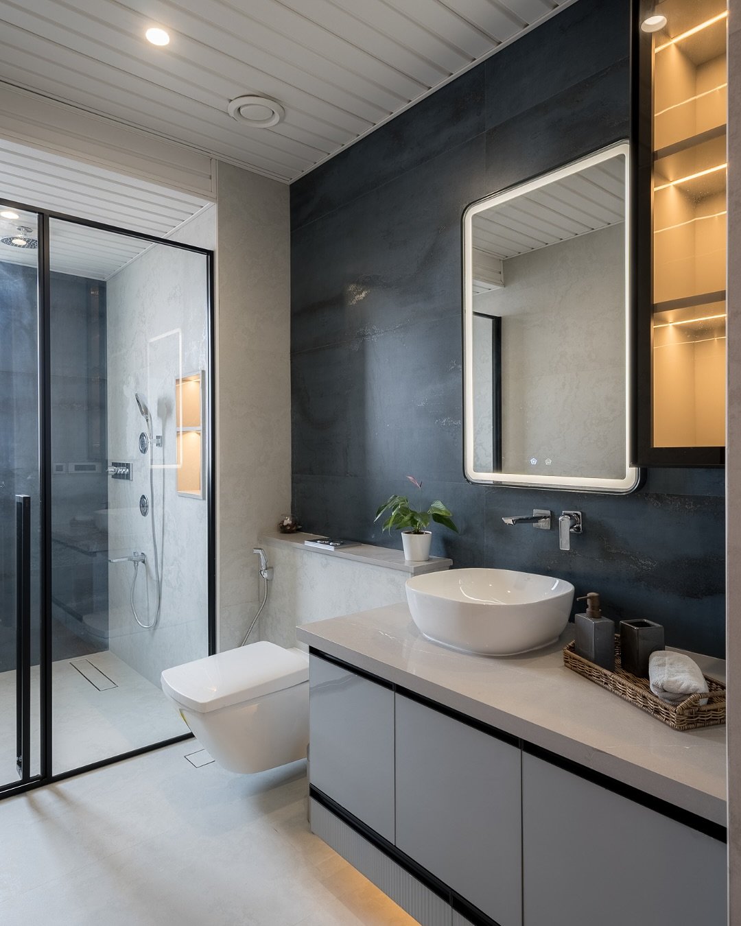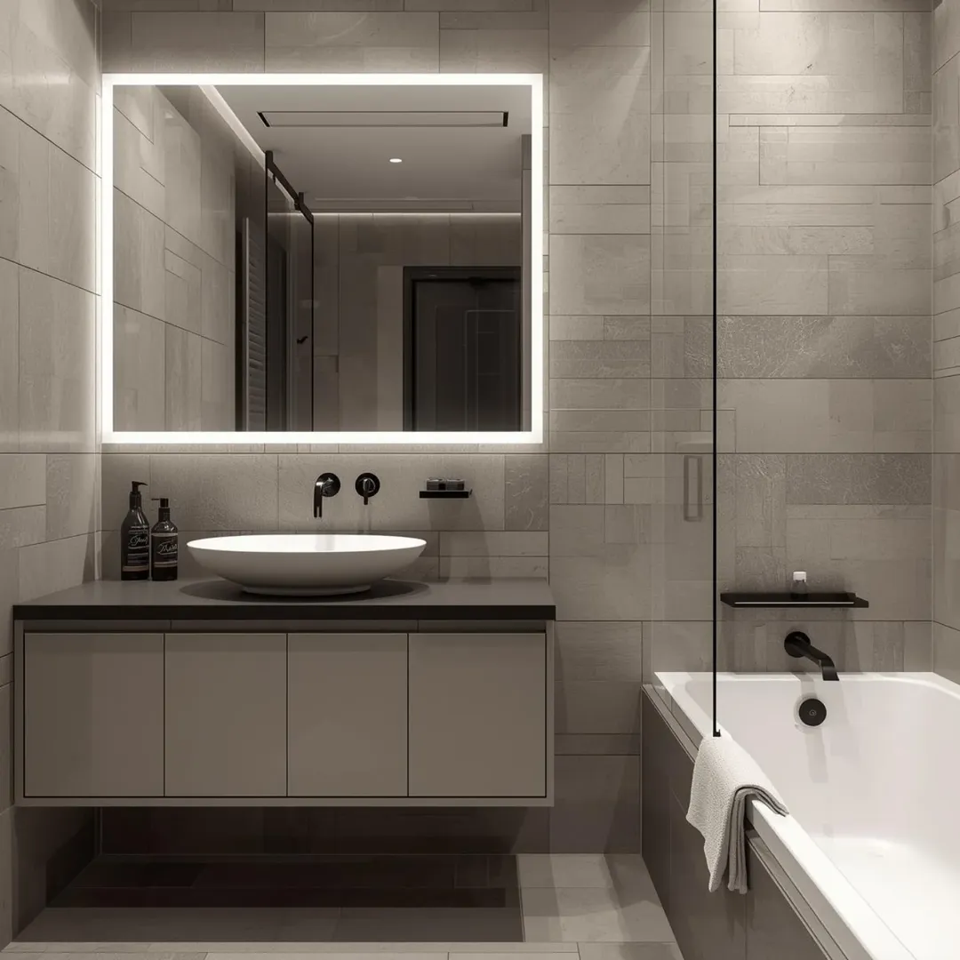 This one gives boutique hotel energy. The floating vanity, underlighting, and that clean grey palette all work together to create a polished, high-end feel.