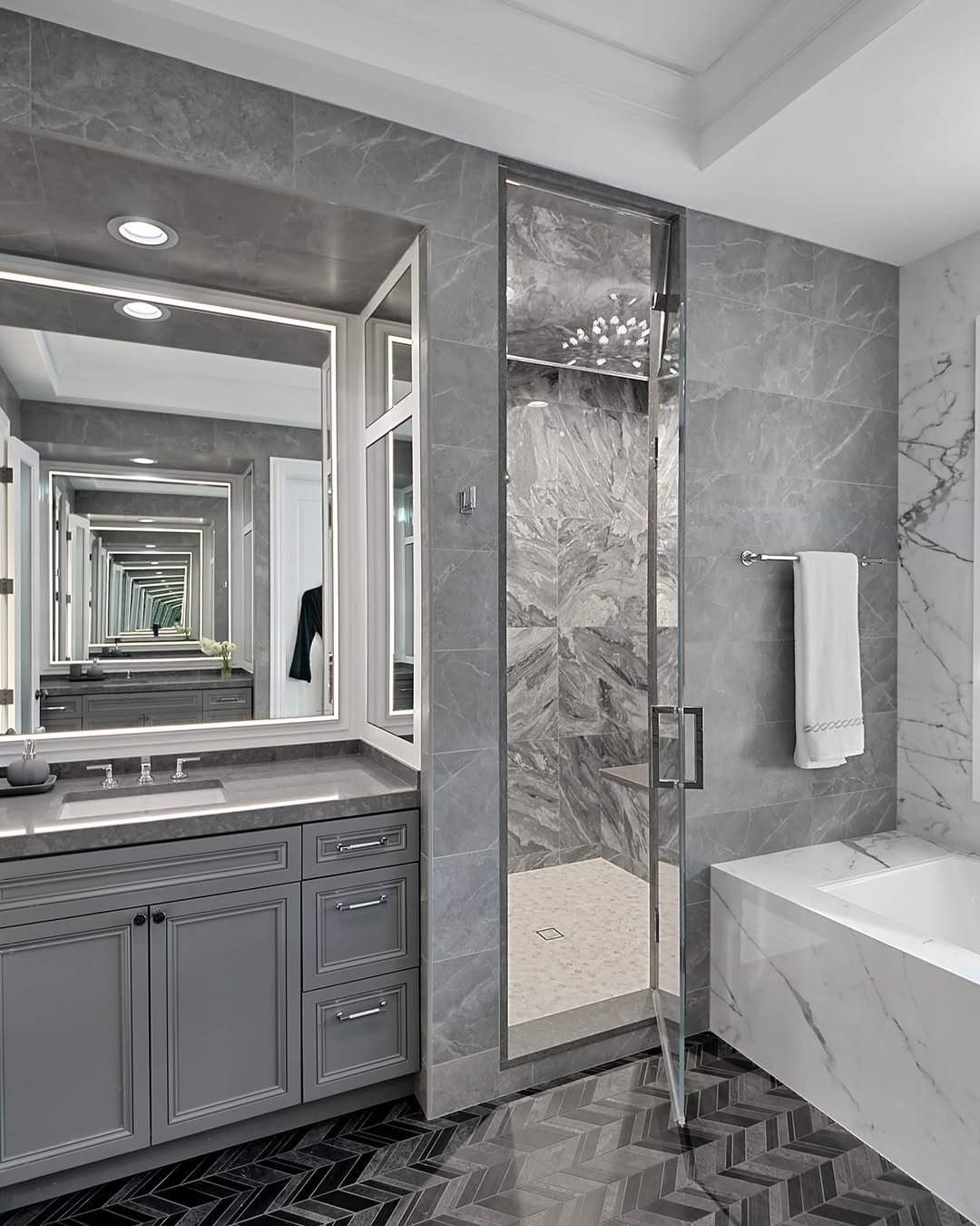This one plays with perspective in the coolest way. That endless mirror reflection instantly makes the space feel double (or triple) the size, while the layered greys keep everything grounded and sophisticated.