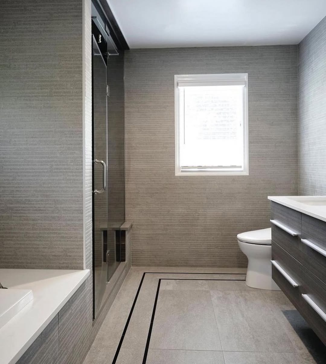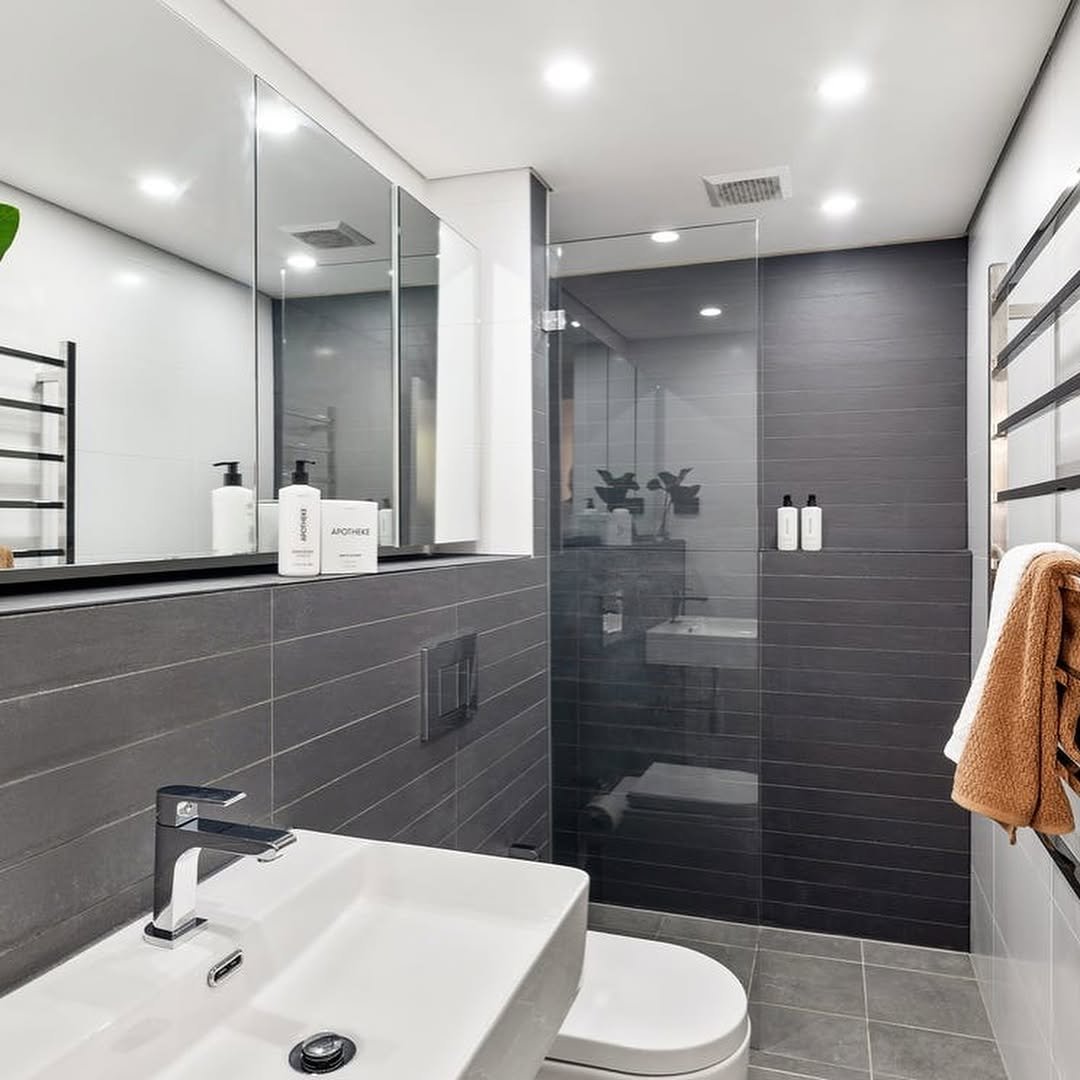 This space knows exactly how to balance light and dark. Crisp white fixtures pop against the deeper grey tiles, creating that fresh, modern contrast everyone loves.