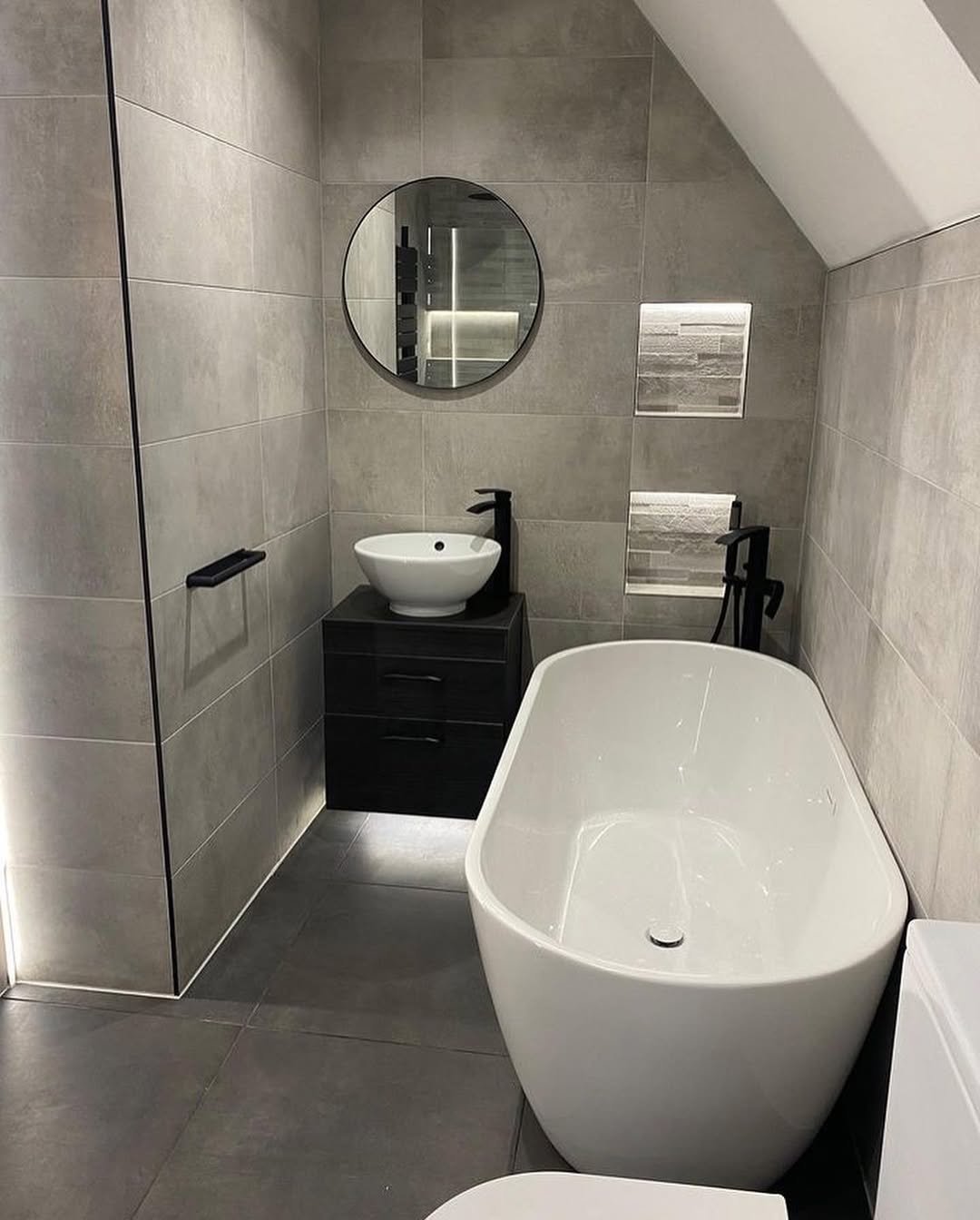 There’s something about a freestanding tub in a grey palette that just feels… expensive. The darker tones, paired with black fixtures and that sloped ceiling, give it a cozy, tucked-away feel.