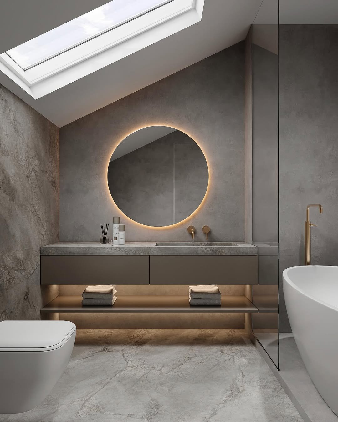 That backlit round mirror? Instant mood. The soft lighting paired with warm grey tones gives this space a cozy, almost hotel-suite feel.