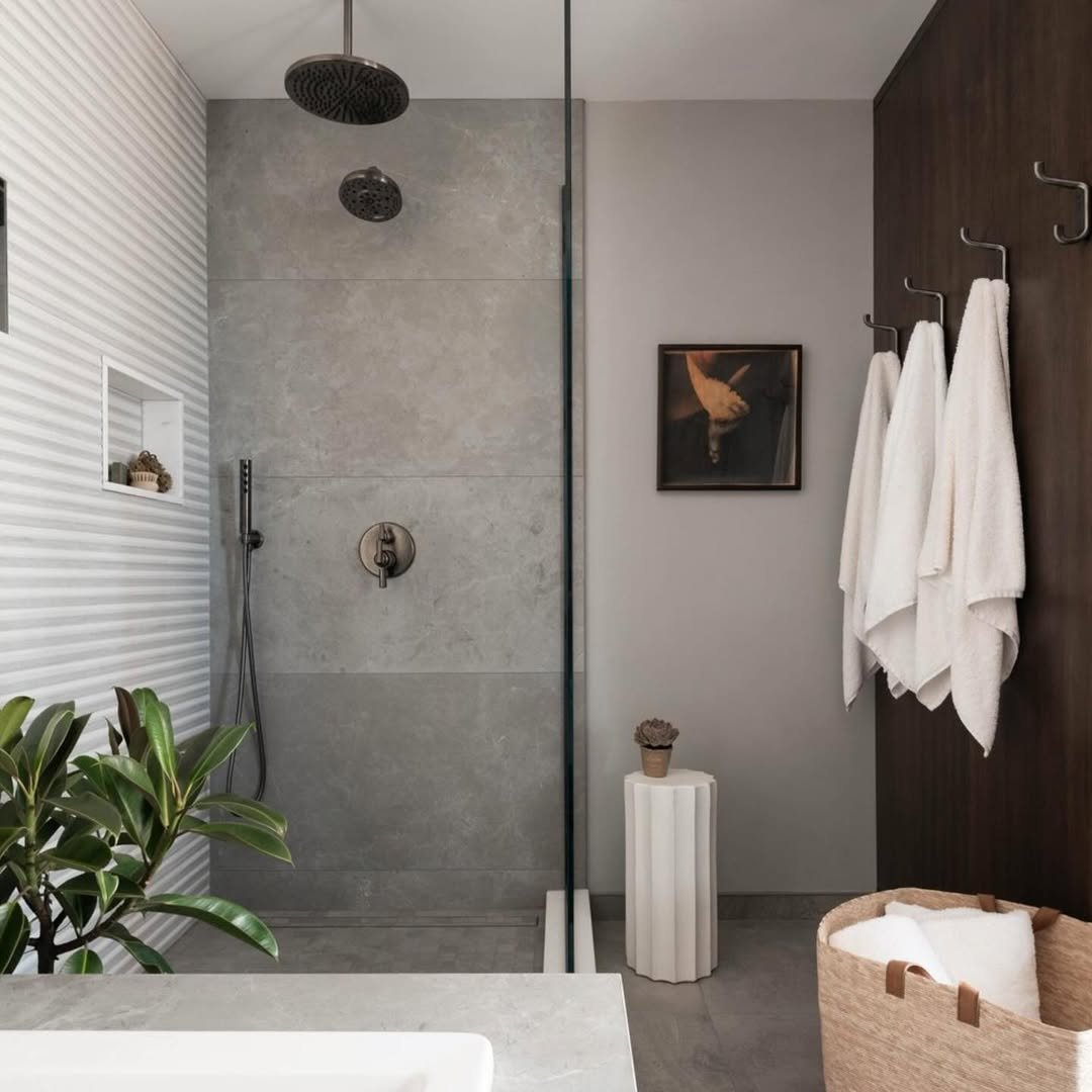 This one feels like a deep breath the moment you walk in. The soft grey palette, paired with that ribbed wall texture and matte black fixtures, creates a calm, almost spa-like vibe without trying too hard.