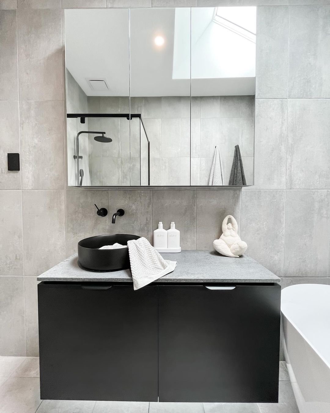 This is where grey meets bold. The black vanity, fixtures, and accents pop hard against the soft grey backdrop, creating that high-contrast look everyone’s loving right now.