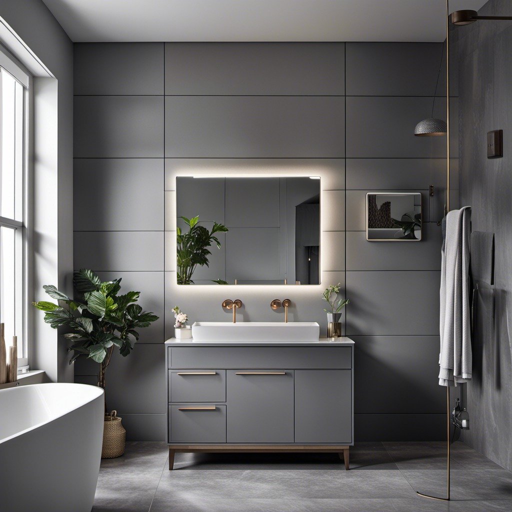 This one gives that polished, almost editorial look. The clean-lined vanity, subtle lighting, and muted greys create a space that feels super refined.