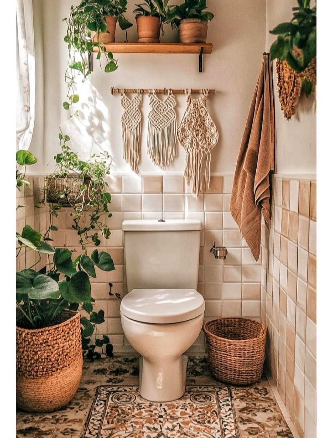 This one feels like sunshine. Soft beige tiles, woven textures, trailing plants—it all comes together in a way that feels relaxed and a little bit earthy. Nothing is overdone, but every detail adds warmth.