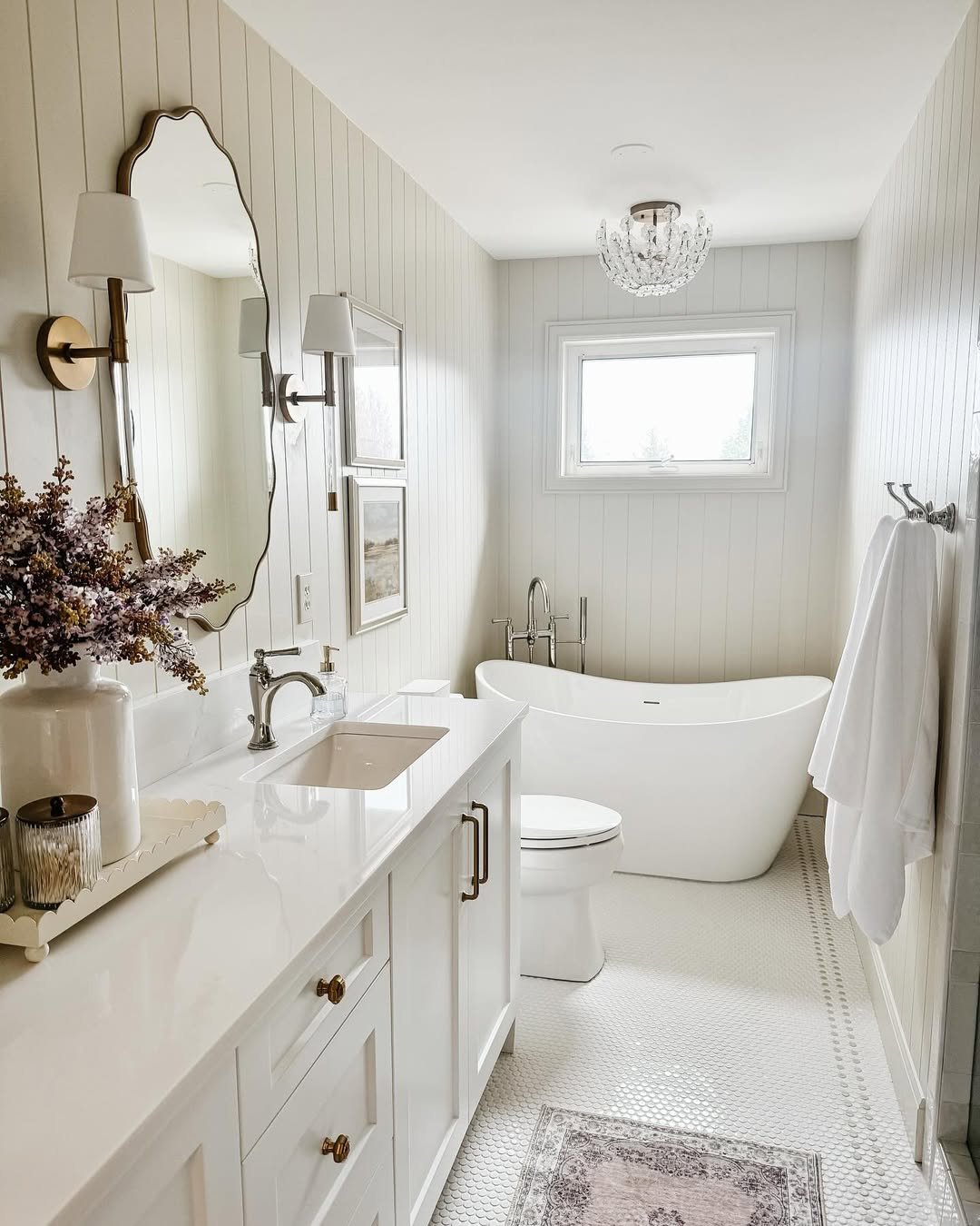 This one is pure light and charm. White-on-white, soft textures, and that freestanding tub moment—it feels airy, calm, and just a little bit dreamy. The vintage touches add just enough character.