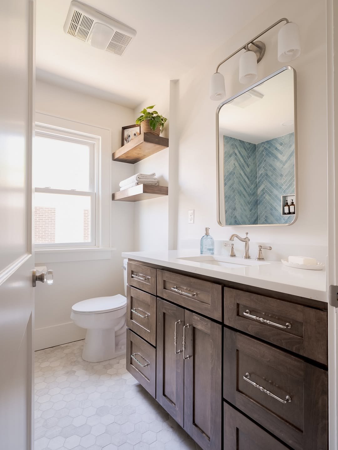 This one leans into practicality, but makes it look good. The floating shelves, natural light, and clean vanity setup all feel easy and livable.