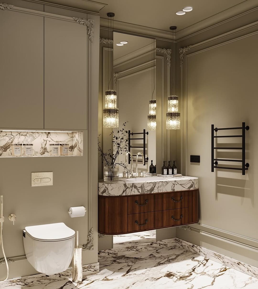 Now this is where things get a little fancy. The marble, warm lighting, and floating vanity all come together in a way that feels polished but not cold. It’s giving hotel—but make it personal.