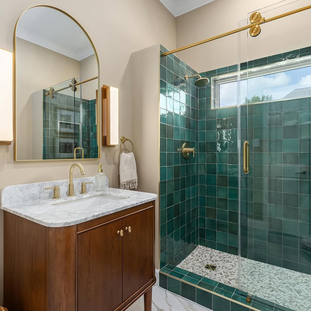 Traditional at first glance—but then that green tile shower pulls you in. It adds personality without overwhelming the space, especially paired with those warm wood tones.