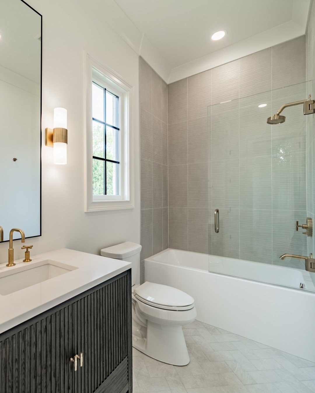 This is minimal done right. Soft gray tiles, crisp white surfaces, and just enough black detailing to keep it from feeling flat. It’s simple—but elevated.