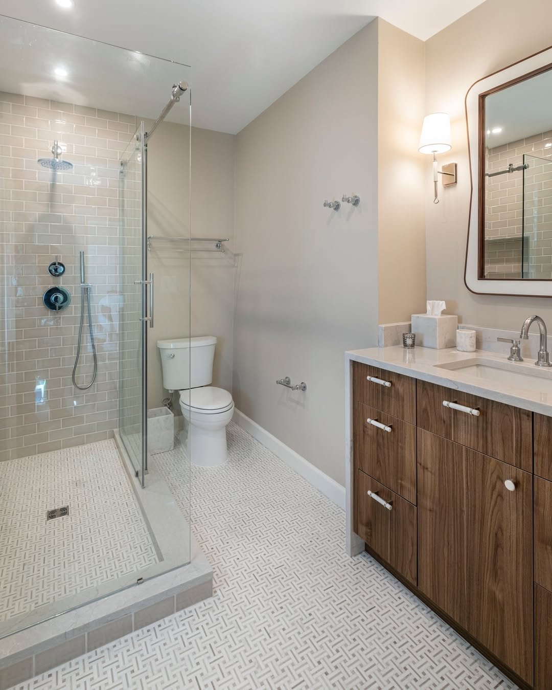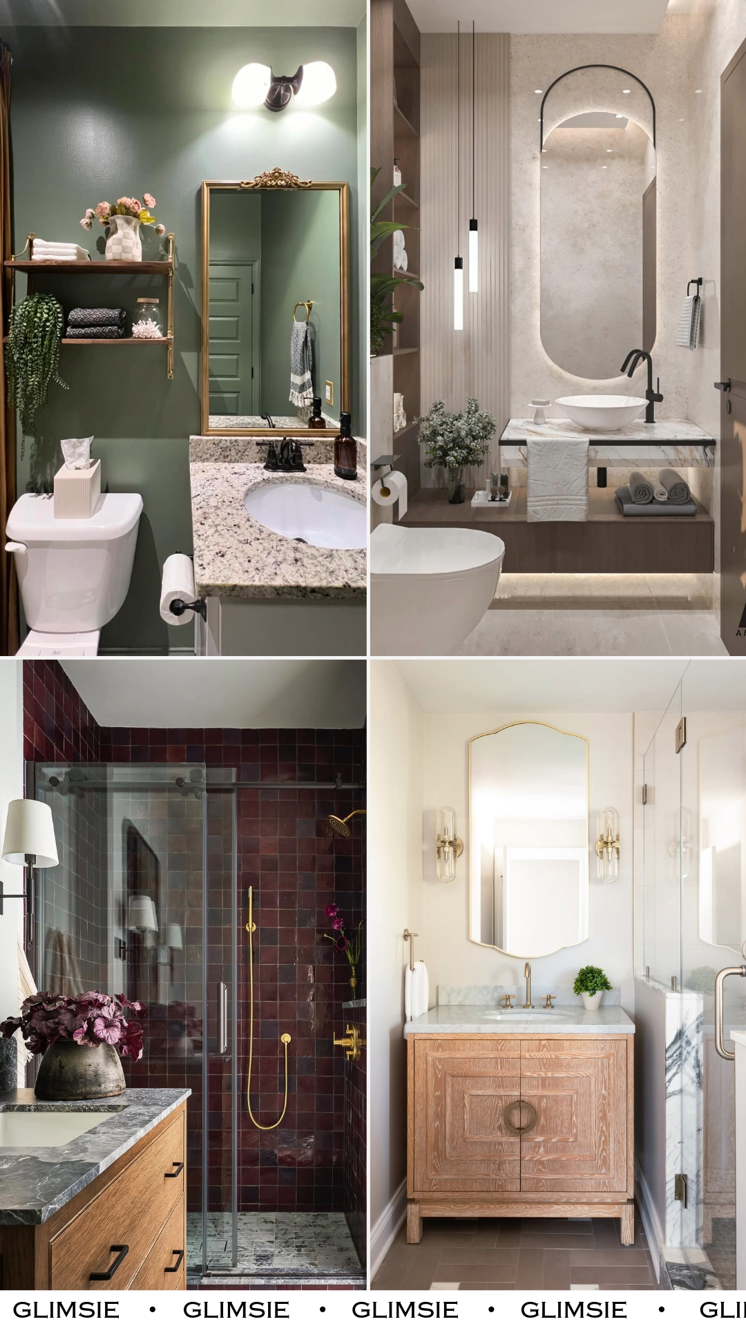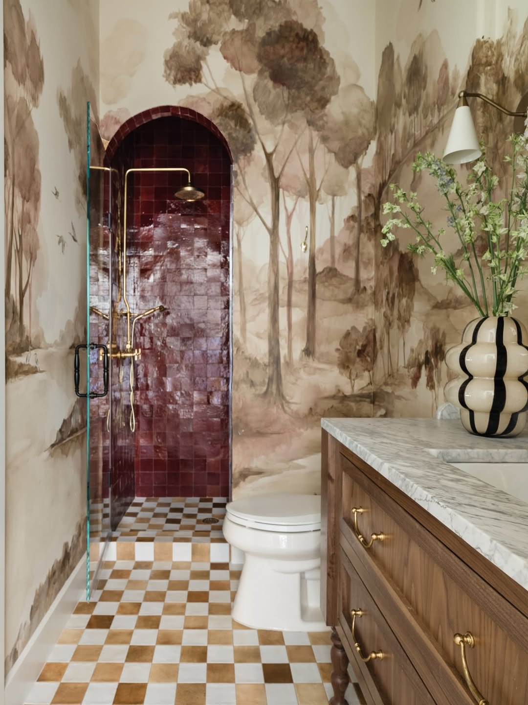 This one is all about contrast. Those rich burgundy tiles in the shower bring depth and drama, while the wood vanity and marble floor soften things just enough to keep it balanced. And the brass fixtures? They’re doing a lot of heavy lifting—in a good way.