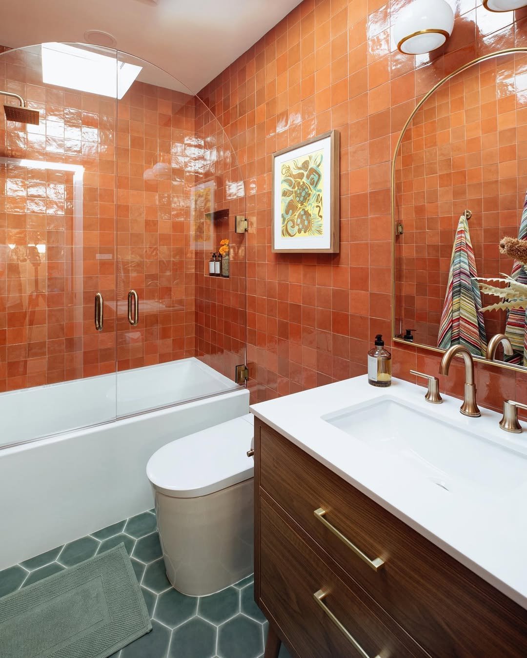 Now this is fun. That glossy orange tile instantly wakes up the whole space, while the softer tones on the floor balance it out so it doesn’t feel too loud. It’s bold, but still super approachable.