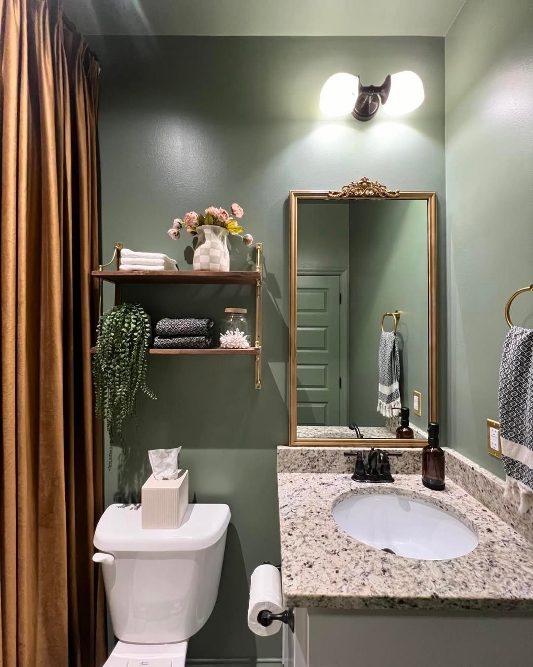 This little guest bath leans all the way into mood—in the best way. That deep olive wall color instantly wraps the space, while the warm wood shelf and brass touches keep it from feeling too heavy. It’s compact, but everything feels considered, from the trailing plant to the soft curtain moment on the side.