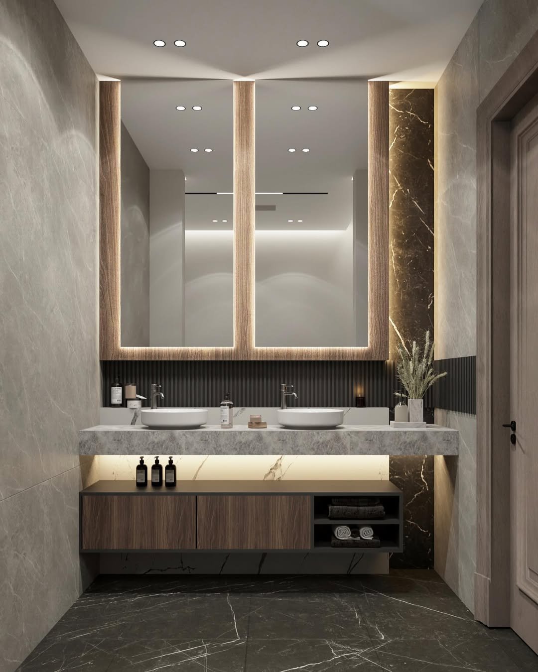 Clean lines, floating vanity, and soft backlighting—this one leans fully into that modern spa aesthetic. The symmetry of the mirrors and sinks just hits right.