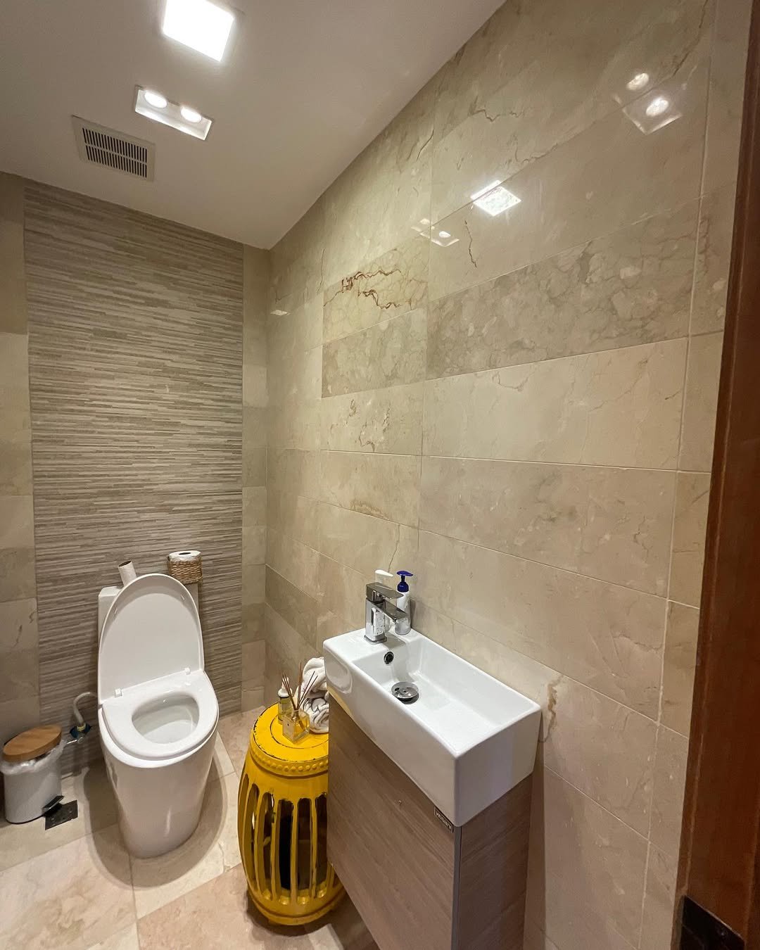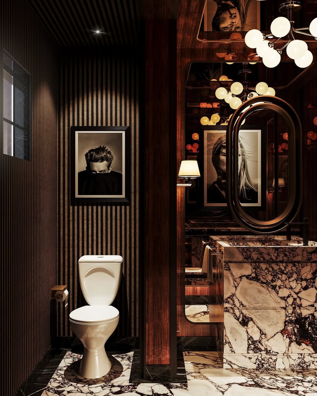 Now this is a whole vibe. Deep wood paneling, bold marble, and those glowing sculptural lights—it’s dramatic in the best way. You walk in and instantly feel like you’ve entered a high-end lounge.